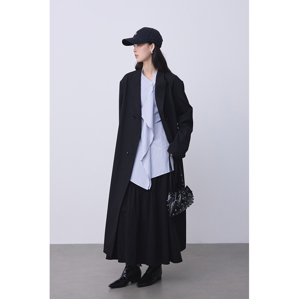 CAREMIND黑色肌理感褶皱a字高腰半身裙气质简约宽松显瘦长裙子夏由