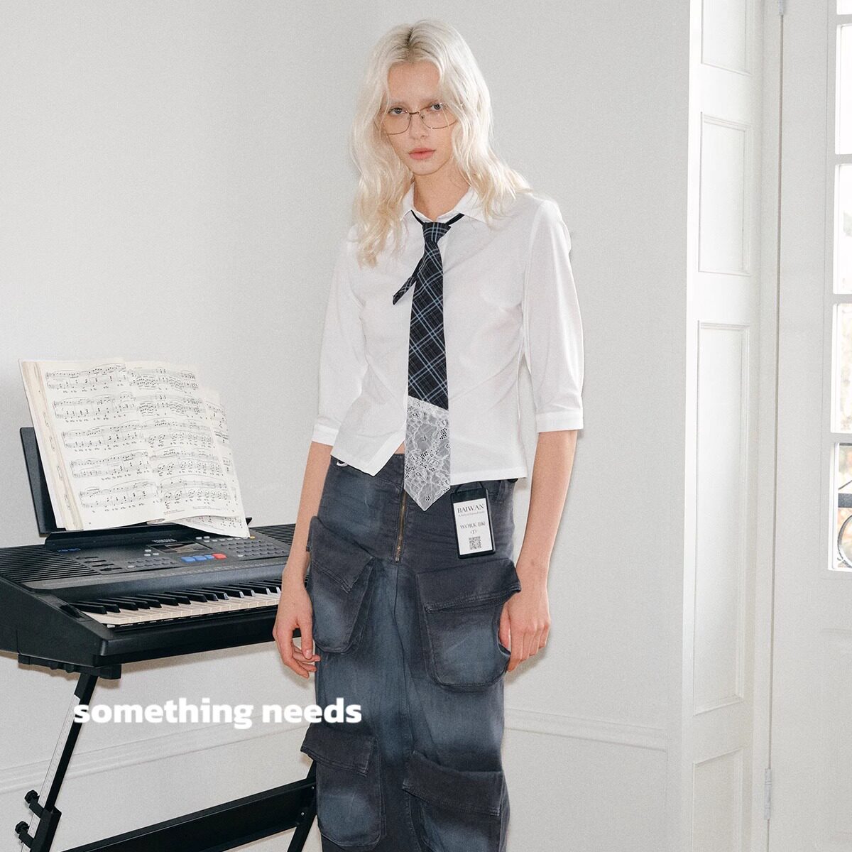 蕾丝格子拼接领带女懒人25新款 纯欲风甜酷领结韩 设计师款 郑佰万由