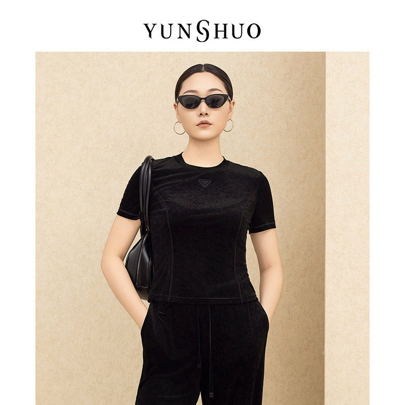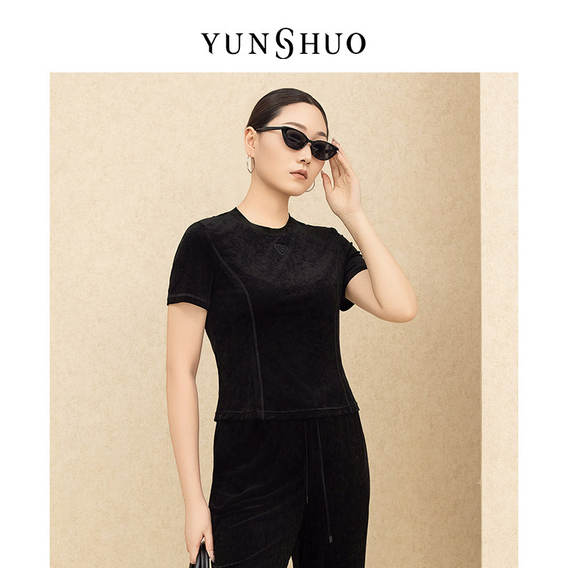 为您提供商品允硕秋夏新品 百搭圆领黑色丝绒T恤短袖 套头女修身 上衣345192 时尚的详细介绍,