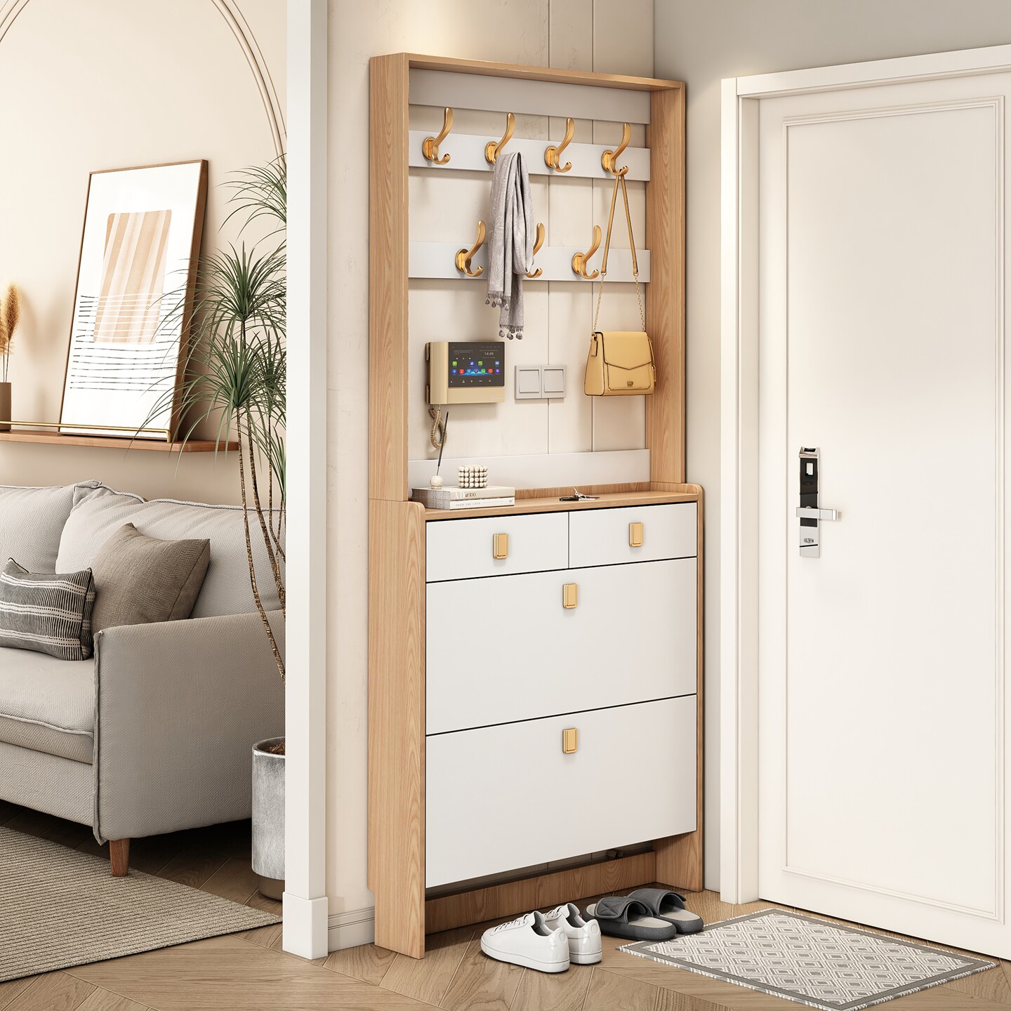 为您提供商品北欧实木超薄翻斗鞋 架 柜带挂衣架多功能门厅柜家用门口进门收纳鞋的详细介绍,