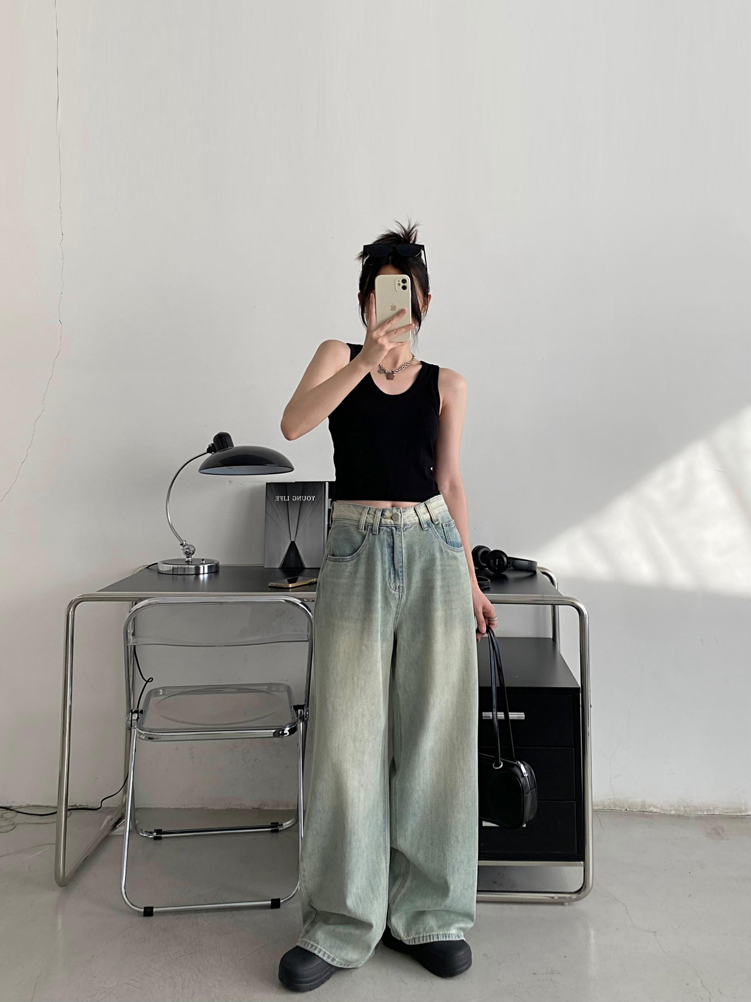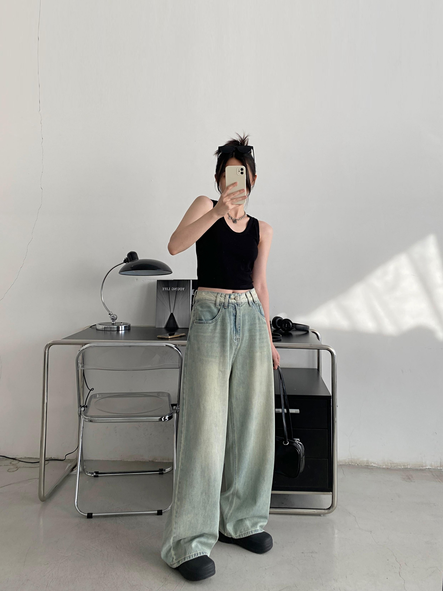 pusumede 复古阔腿牛仔裤 女宽松显瘦垂感直筒拖地长裤 摩登sense