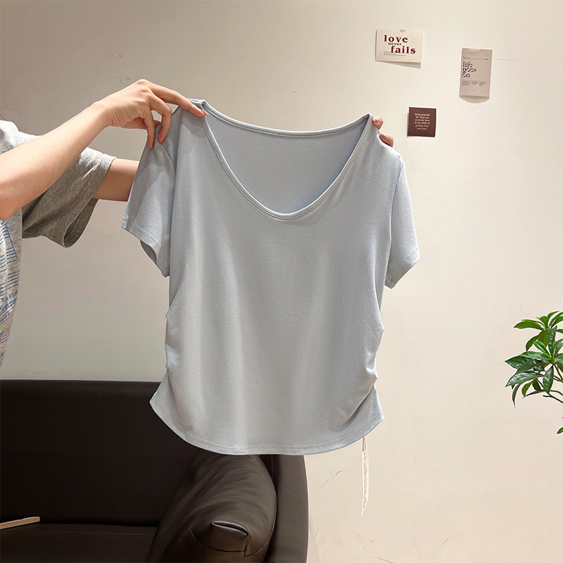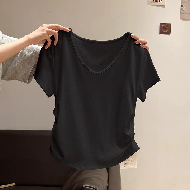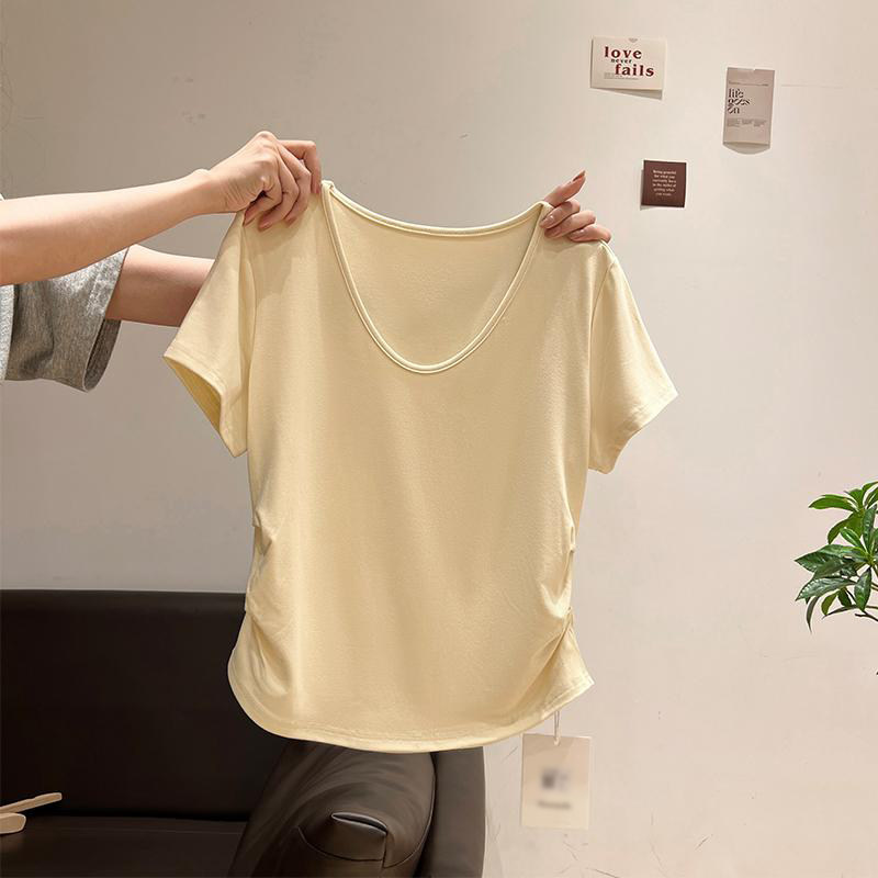拉夏贝尔奶黄低领正肩短袖 2025新款 小个子褶皱短款 上衣 T恤女夏季