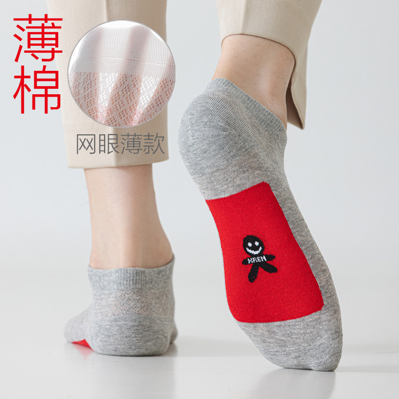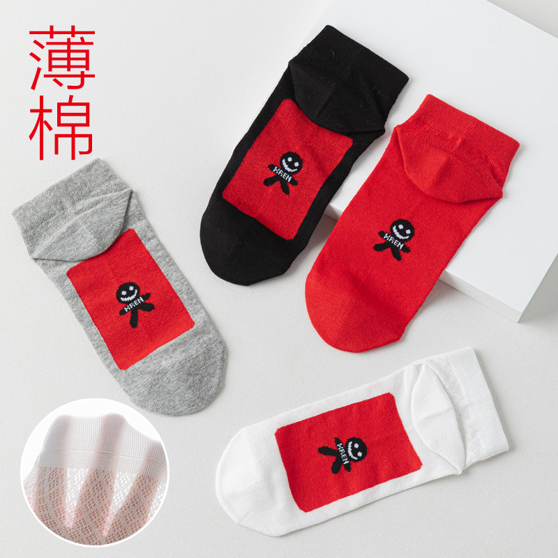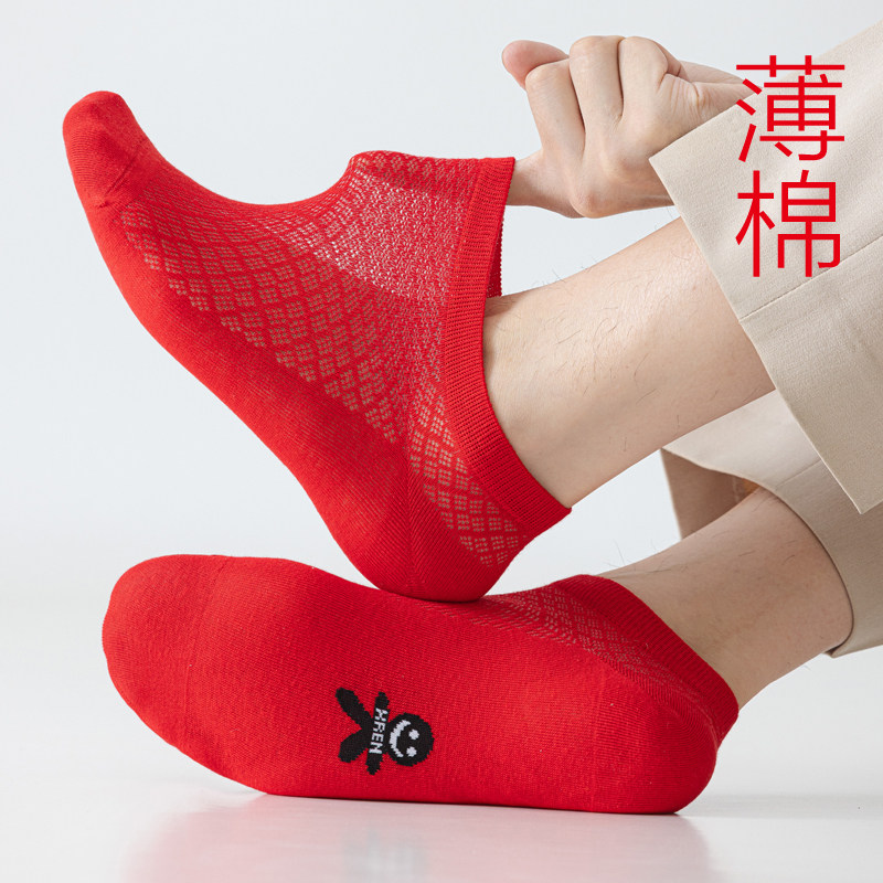 网眼本命年男女红色短袜船袜情侣小人走鸿运七星袜 超薄红袜子夏季