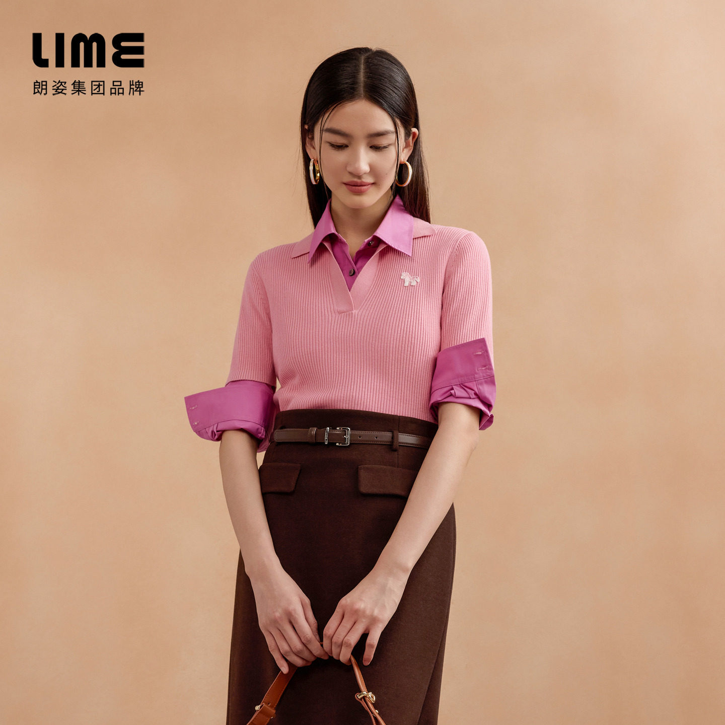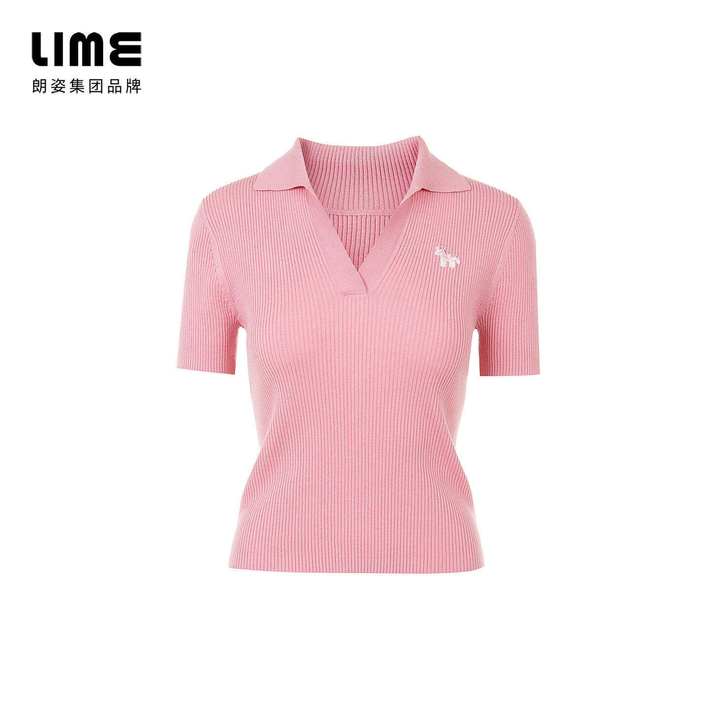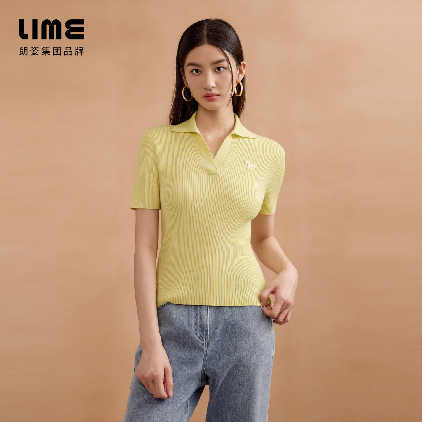 女polo领短袖 25秋新款 朗姿集团LIME莱茵竖条纹坑条显瘦针织套头衫由