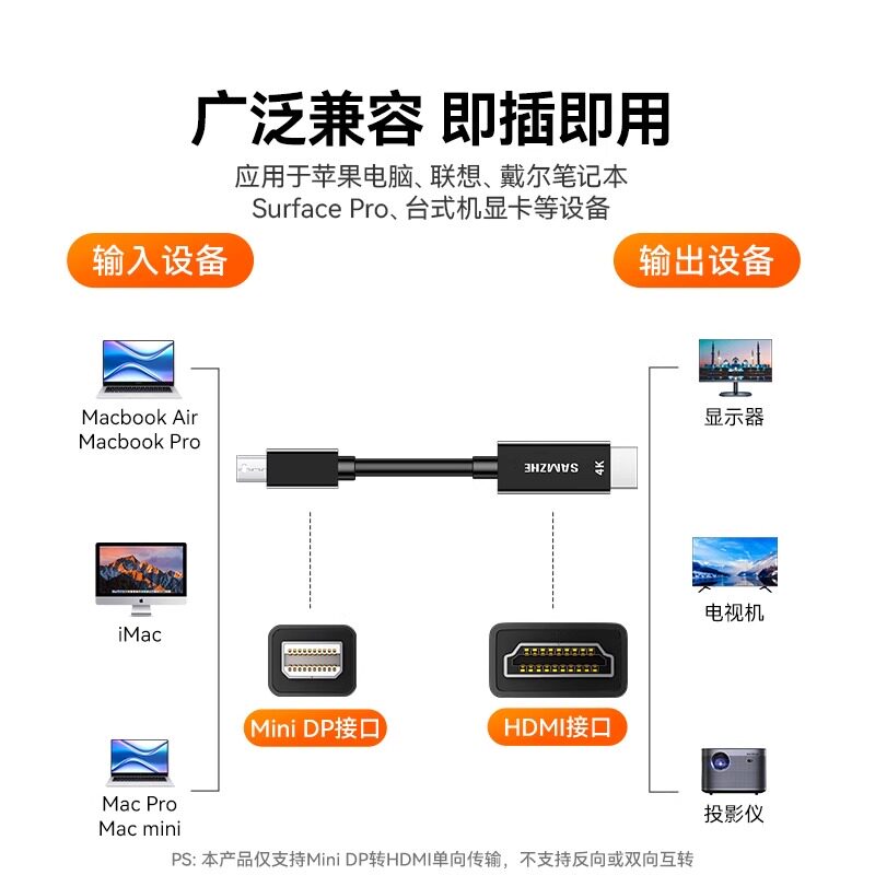 山泽minidp转hdmi线4k家用连接显示器displayport迷你转接头外接由