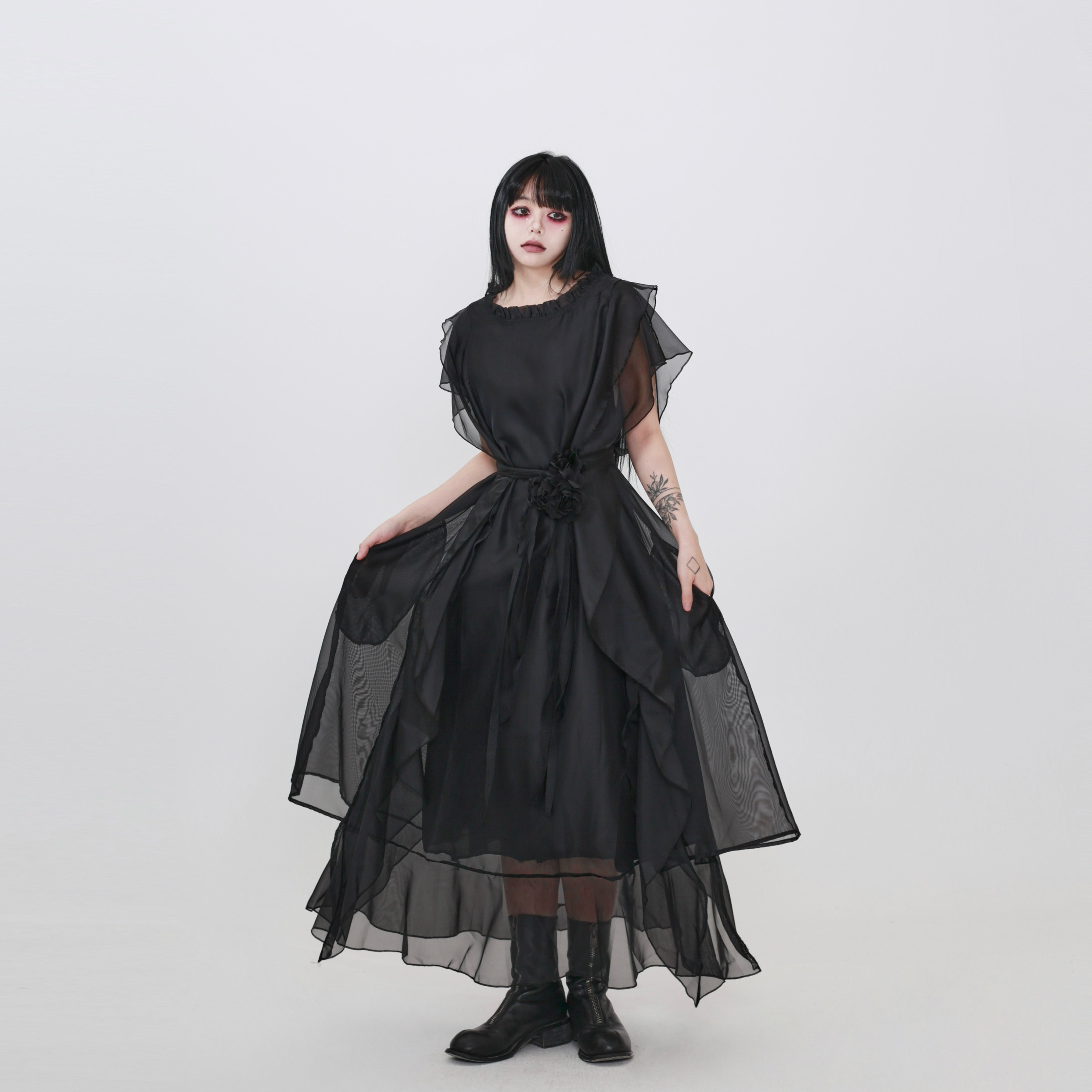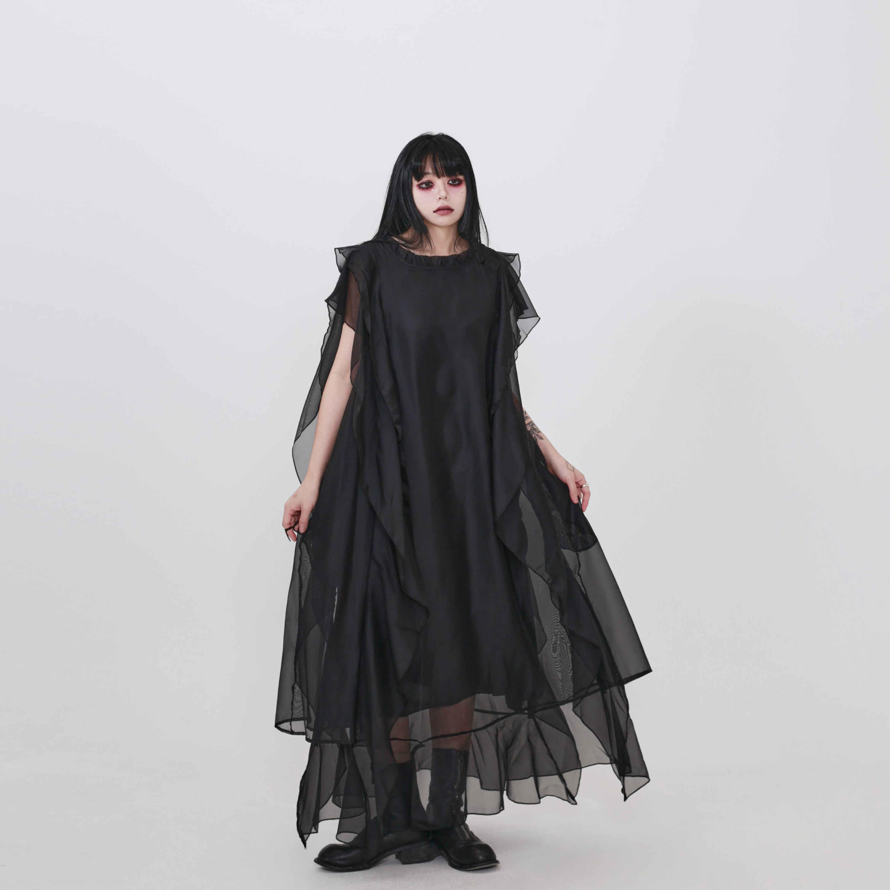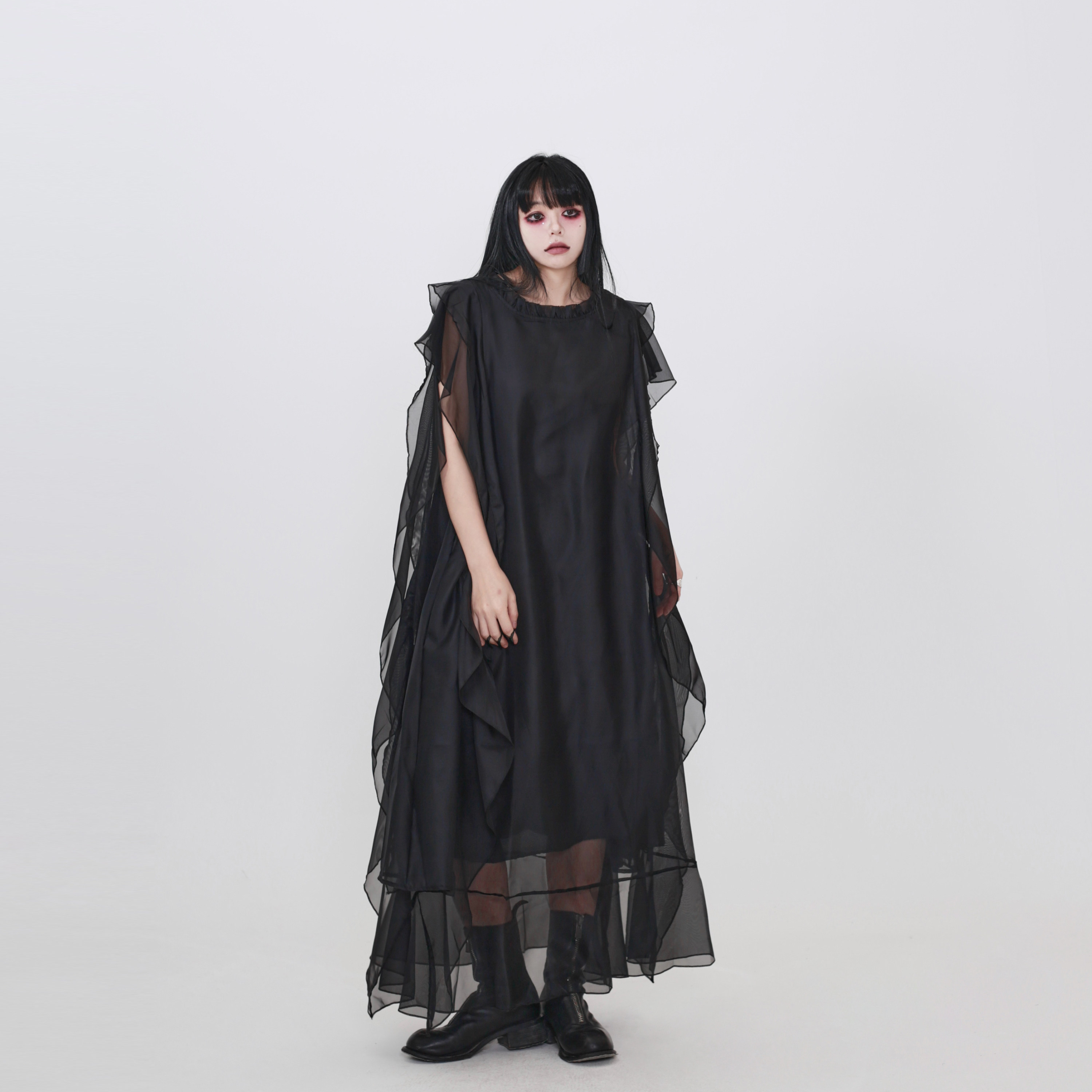 隐觅 背心裙飘逸拼接网纱中长裙连衣裙 设计师暗黑高级感黑色无袖