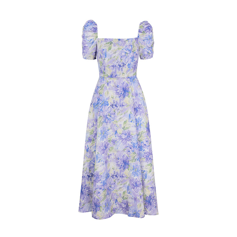 莫奈花园法式 气质紫碎花油画花朵定染显瘦连衣裙高腰长裙 Ching