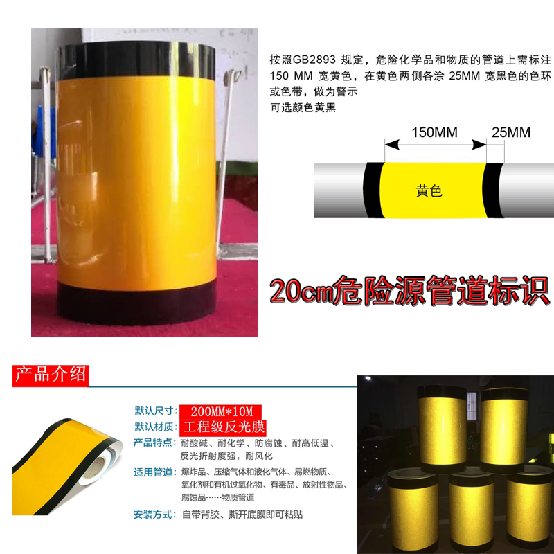 为您提供商品危险源标识 反光黄黑相间管道标识贴管道色环不干胶贴纸 20cm宽黄黑危化品标识 管道危险标识黄黑警示胶带的详细介绍,