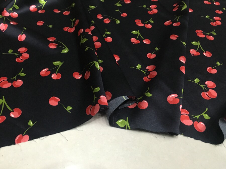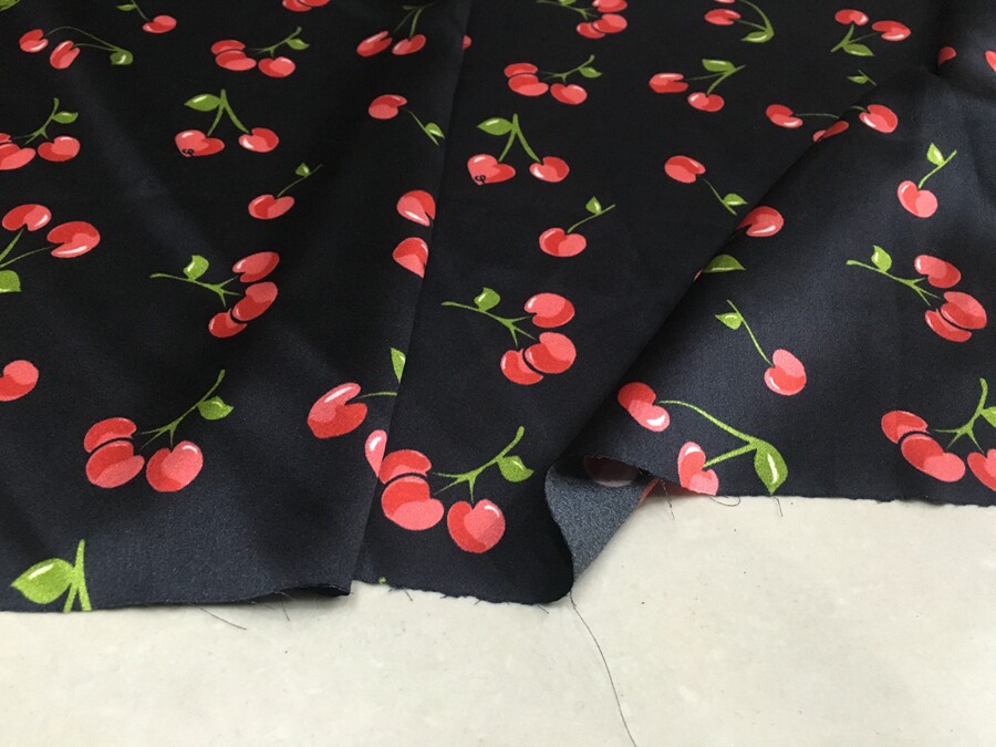 喷绘桑蚕丝面料19姆米宽幅弹力真丝丝绸缎 黑底小樱桃图案印花数码