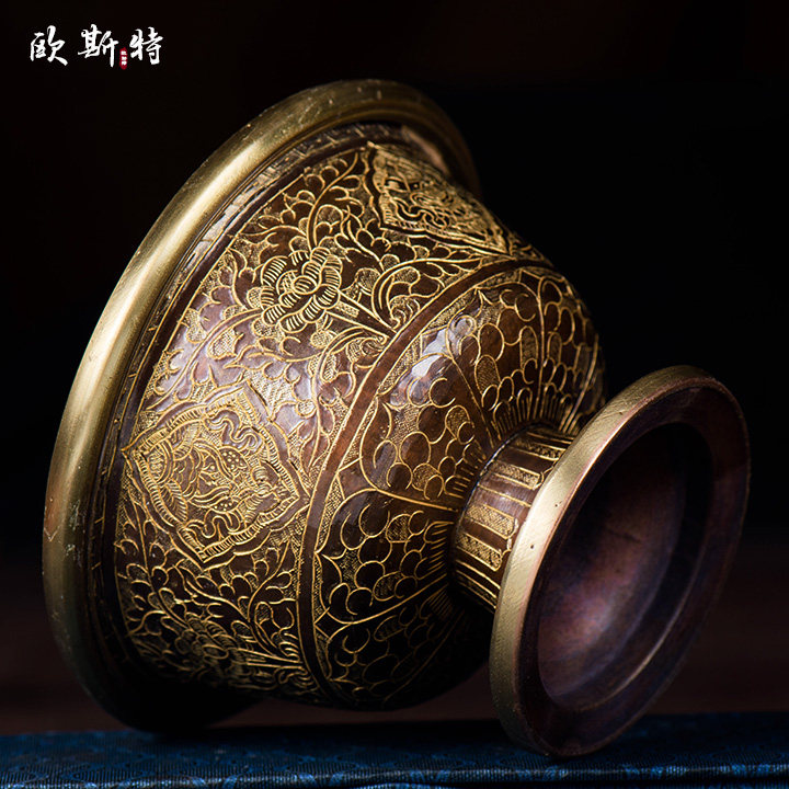 饰用品尼泊尔手工紫铜雕花供水碗 家用高脚供水杯圣水杯 装 欧斯特