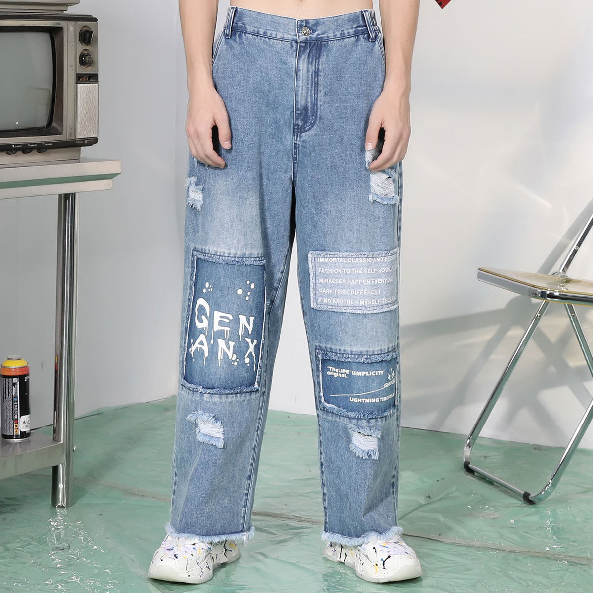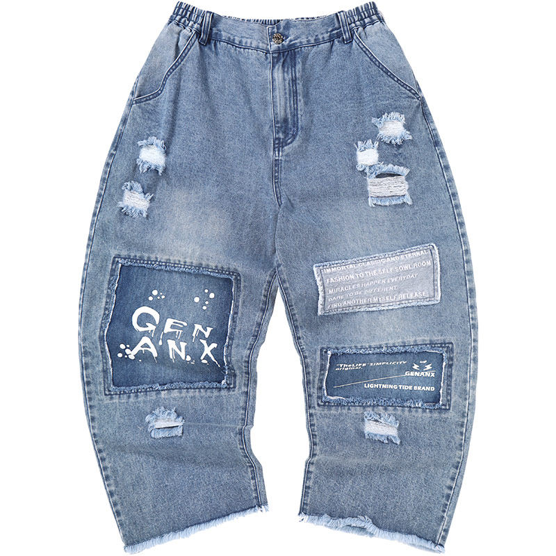 宽松直筒破洞补丁松紧腰油漆印花牛仔裤 学生 男春款 GENANX潮牌长裤