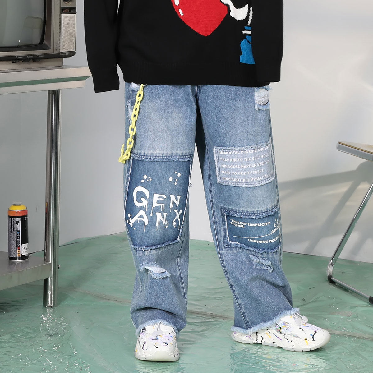 为您提供商品宽松直筒破洞补丁松紧腰油漆印花牛仔裤 学生 男春款 GENANX潮牌长裤的详细介绍,
