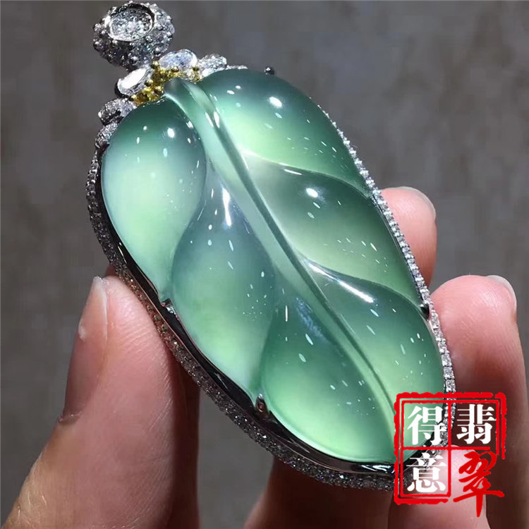 为您提供商品得意翡翠天然冰种翡翠叶子吊坠挂件高冰纯净色美白金镶钻保真带证的详细介绍,
