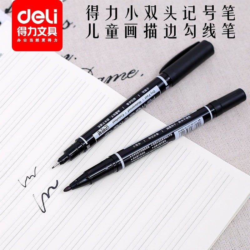 得力勾线笔美术生用油性记号笔粗细双头黑色快干防水粗头勾线笔美术专用小学生儿童画画蓝色红彩色绘画描边笔