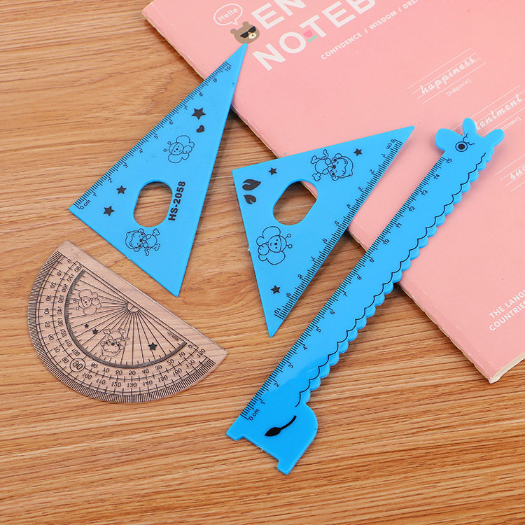 三角板 量角器 复古卡通儿童直尺三角板量角器四件套透明套尺各类尺 可爱小熊尺子套装