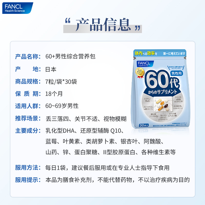 为您提供商品日本FANCL 30袋 包 芳珂男性60岁综合营养包辅酶q10复合维生素的详细介绍,