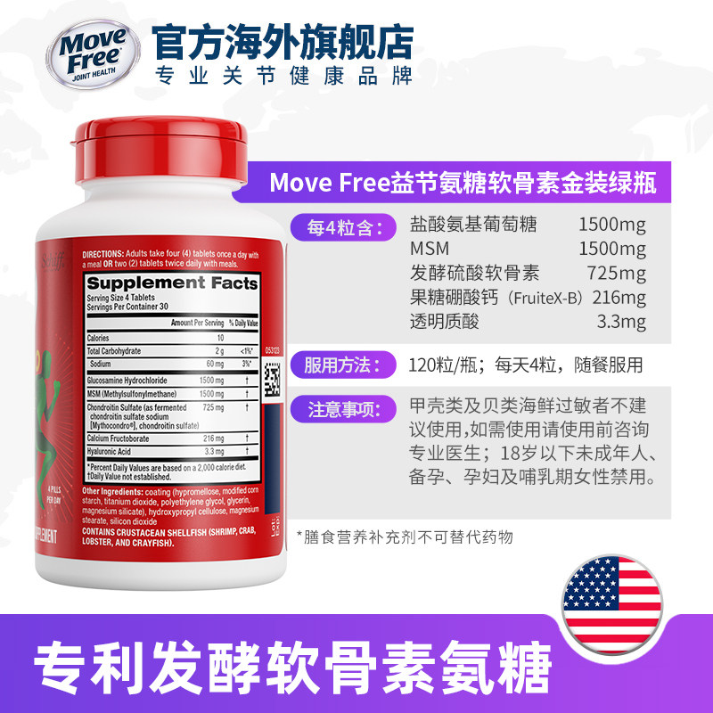 益节MoveFree绿瓶氨糖软骨素MSM中老年养护关节120粒绿标养护关节