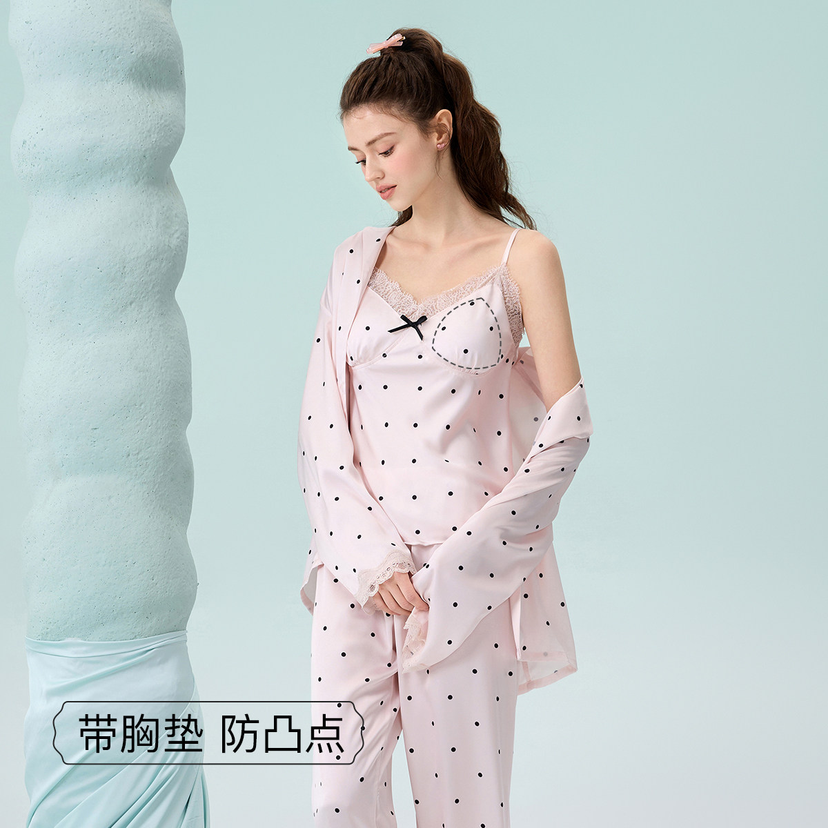冰丝睡衣女款 秋春三件套长袖 带胸垫家居服丝绸夏季 可外穿 2026新款