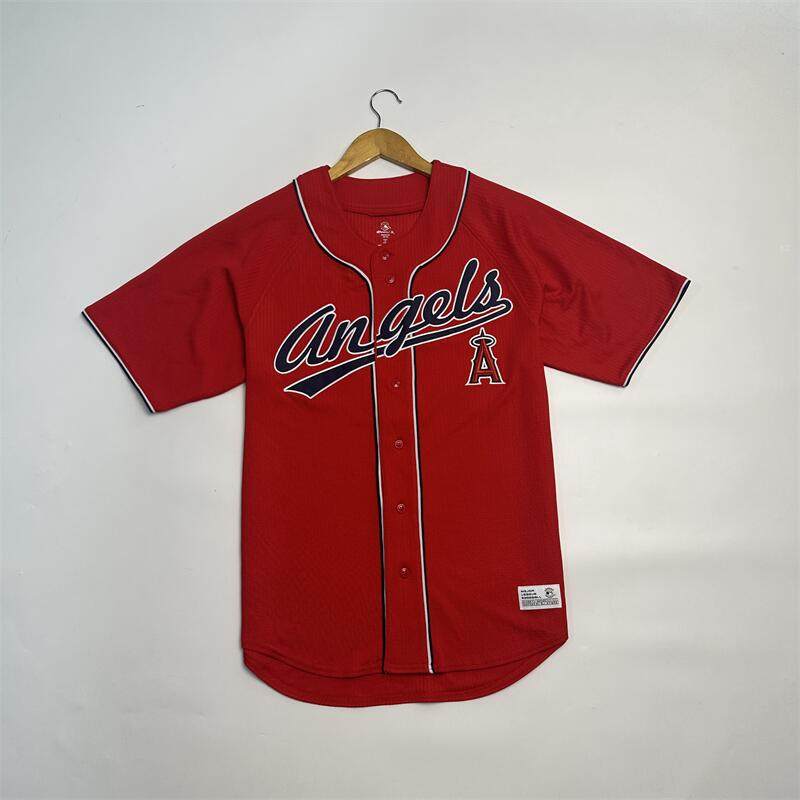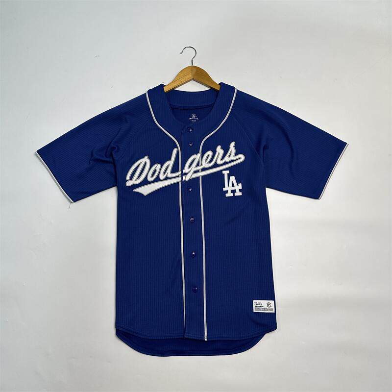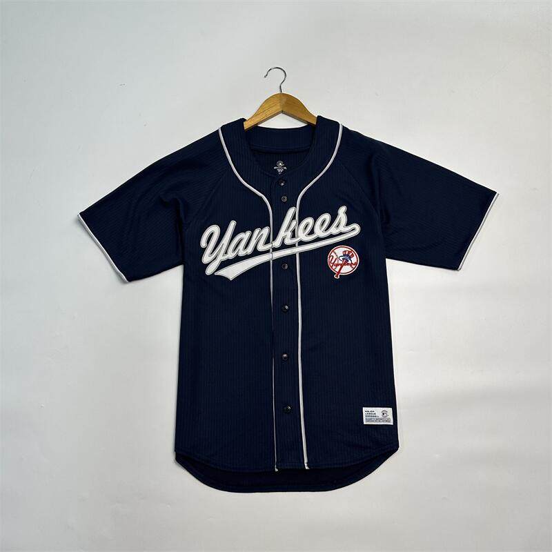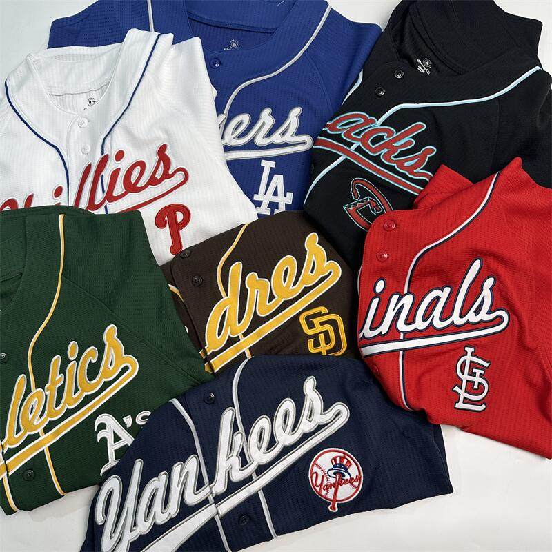 万针刺绣队标插肩袖 25年新品 美国棒球男士 单排纽扣棒球开衫 短袖