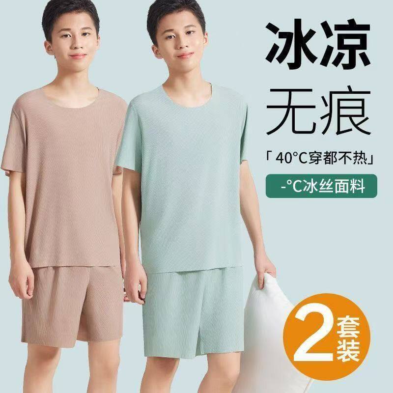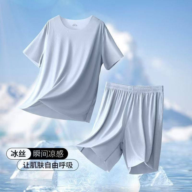 新款 男夏季 超薄冰丝凉感 无痕 t恤短袖 套装 休闲家居服睡衣男士