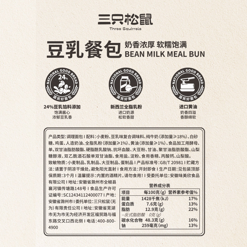 三只松鼠_豆乳餐包360g夹心早餐蛋糕点心健康吐司休闲零食品整箱由