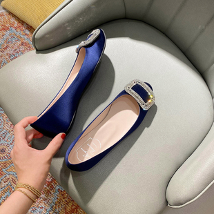 女软底芭蕾舞鞋 一脚蹬休闲 女圆头浅口舒适绸缎婚鞋 RV水钻平底单鞋