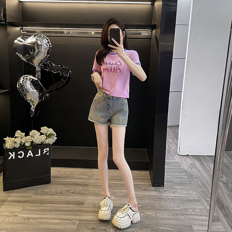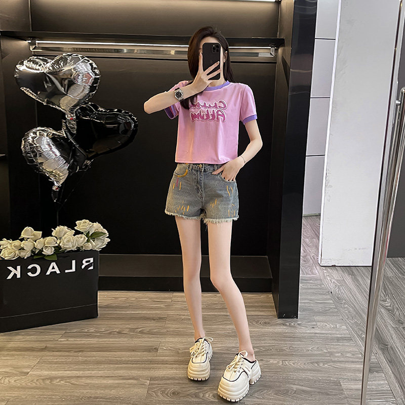 衫 拼色印花短款 上衣 高腰休闲宽松辣妹半袖 新款 露脐t恤女短袖 夏季