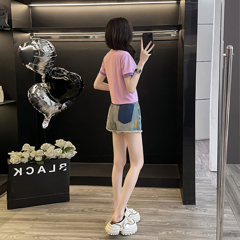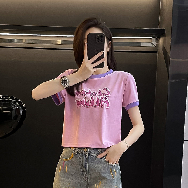 衫 拼色印花短款 上衣 高腰休闲宽松辣妹半袖 新款 露脐t恤女短袖 夏季由