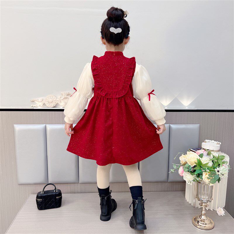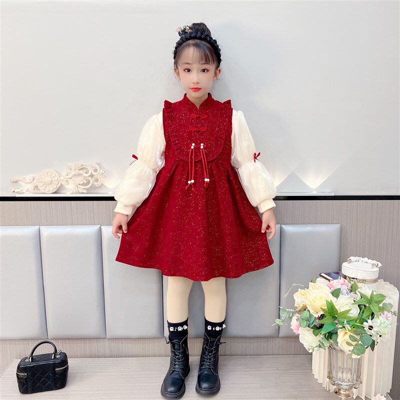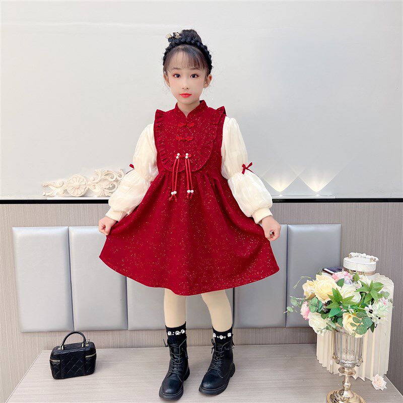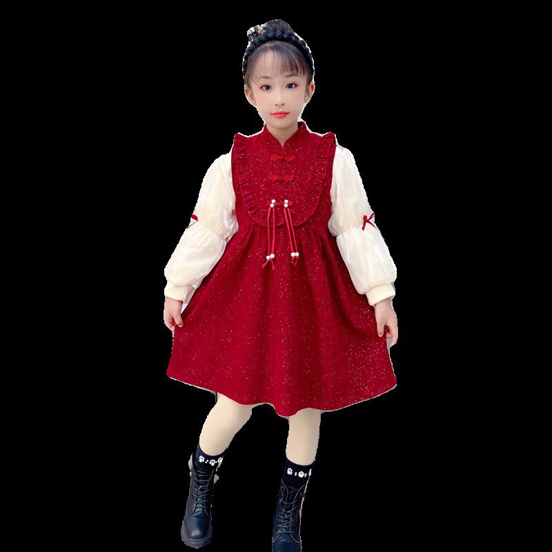 2023新款 洋派红色旗袍裙子儿童两件套公主裙 秋冬装 女童加绒洋装