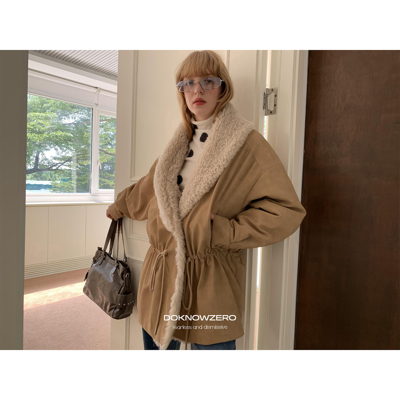 DKZ杏色复古大翻边毛毛领棉服女廓形抽绳夹棉外套 周洁琼同款由