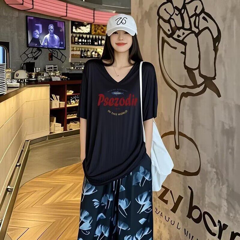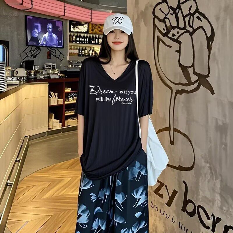 女生宽松棉麻半袖 2026新款 黑色冰丝V领短袖 t恤300斤大码 上衣 薄款由