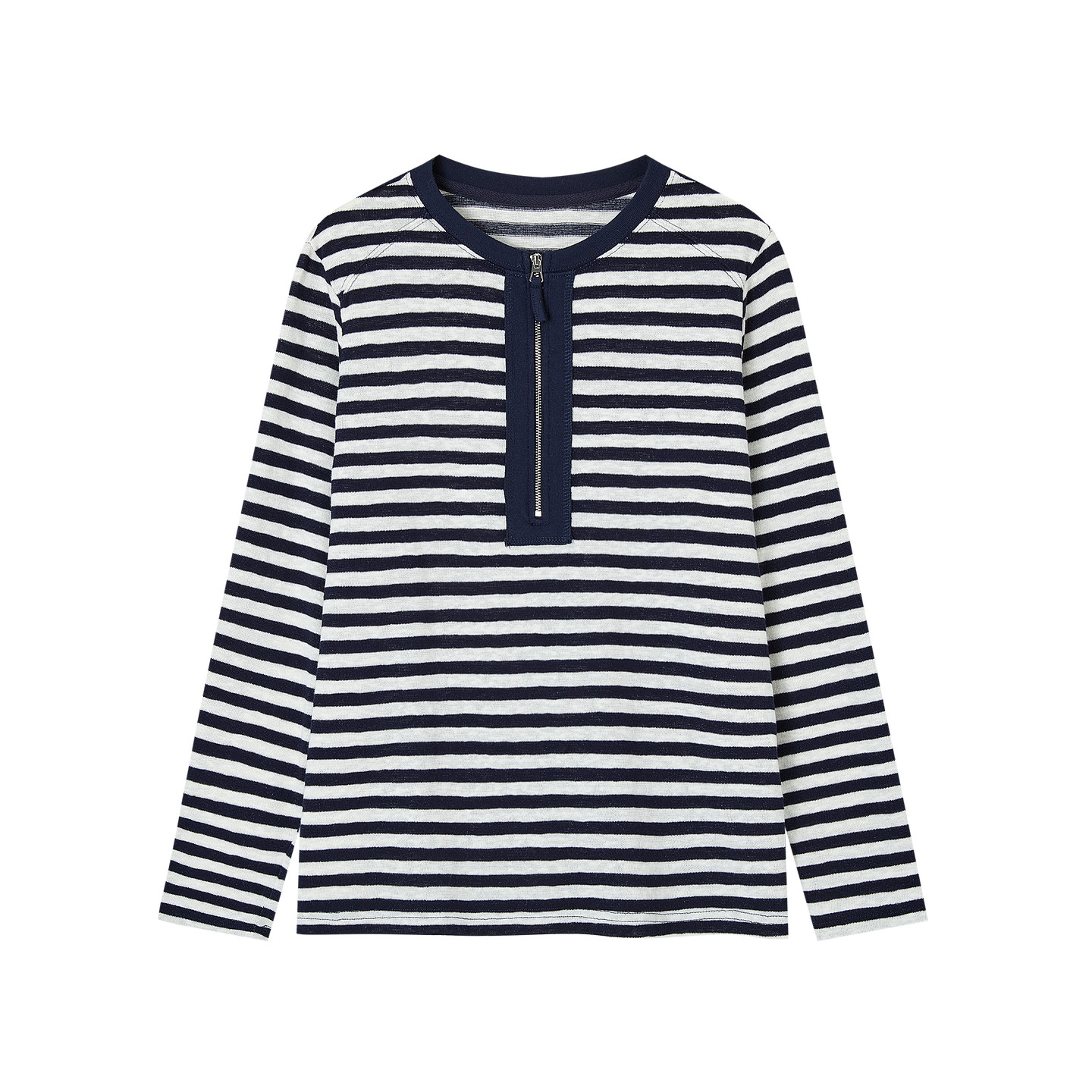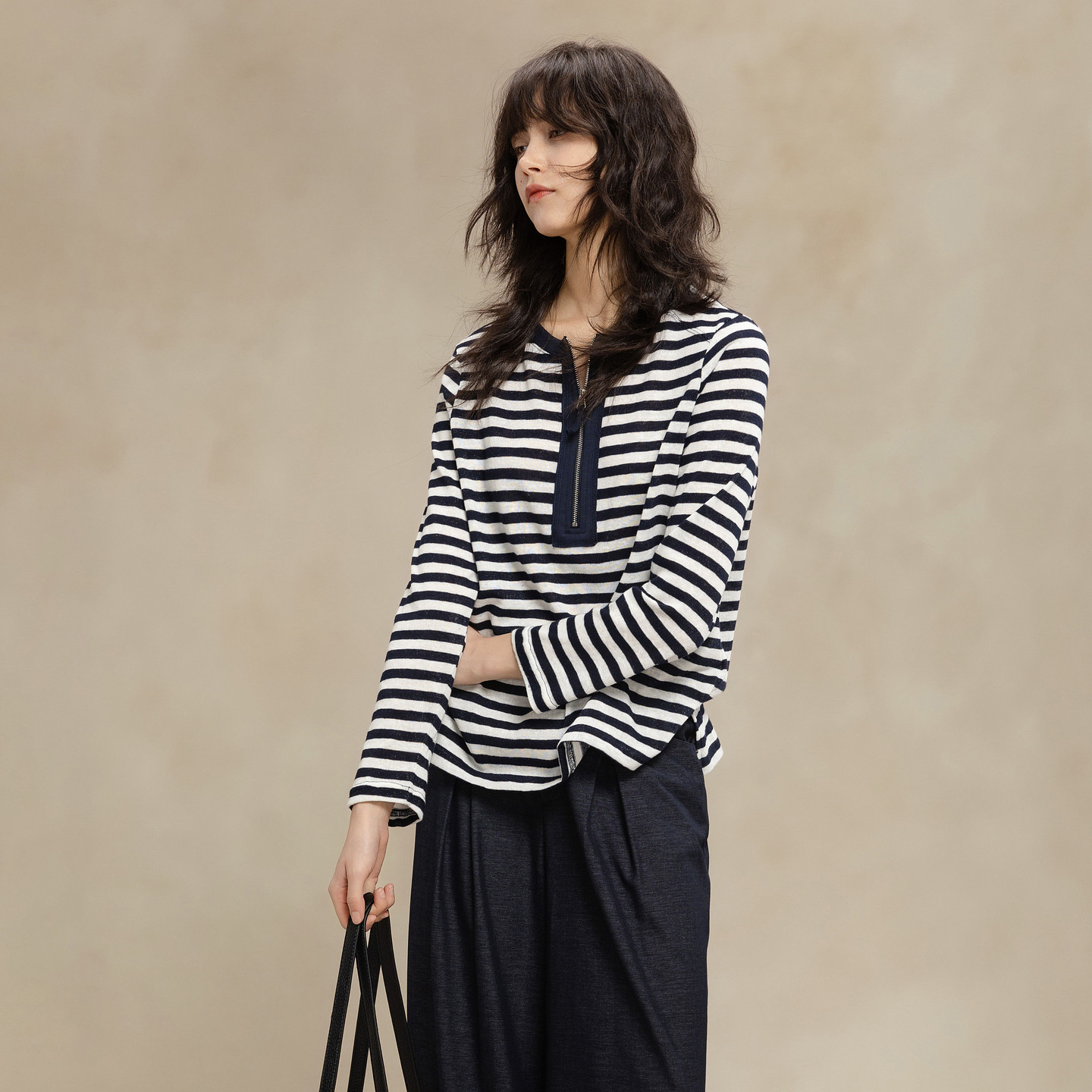德玛纳慵懒宽松撞色条纹T恤女26春季 圆领半拉链舒适休闲上衣 新款