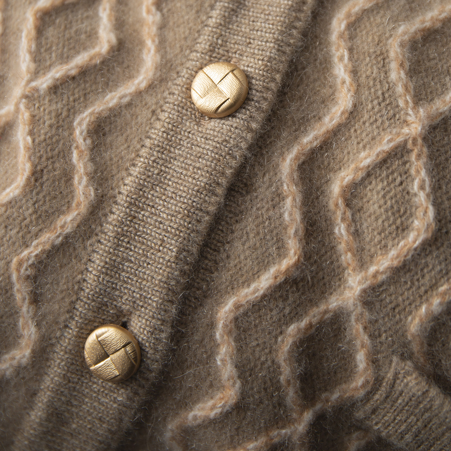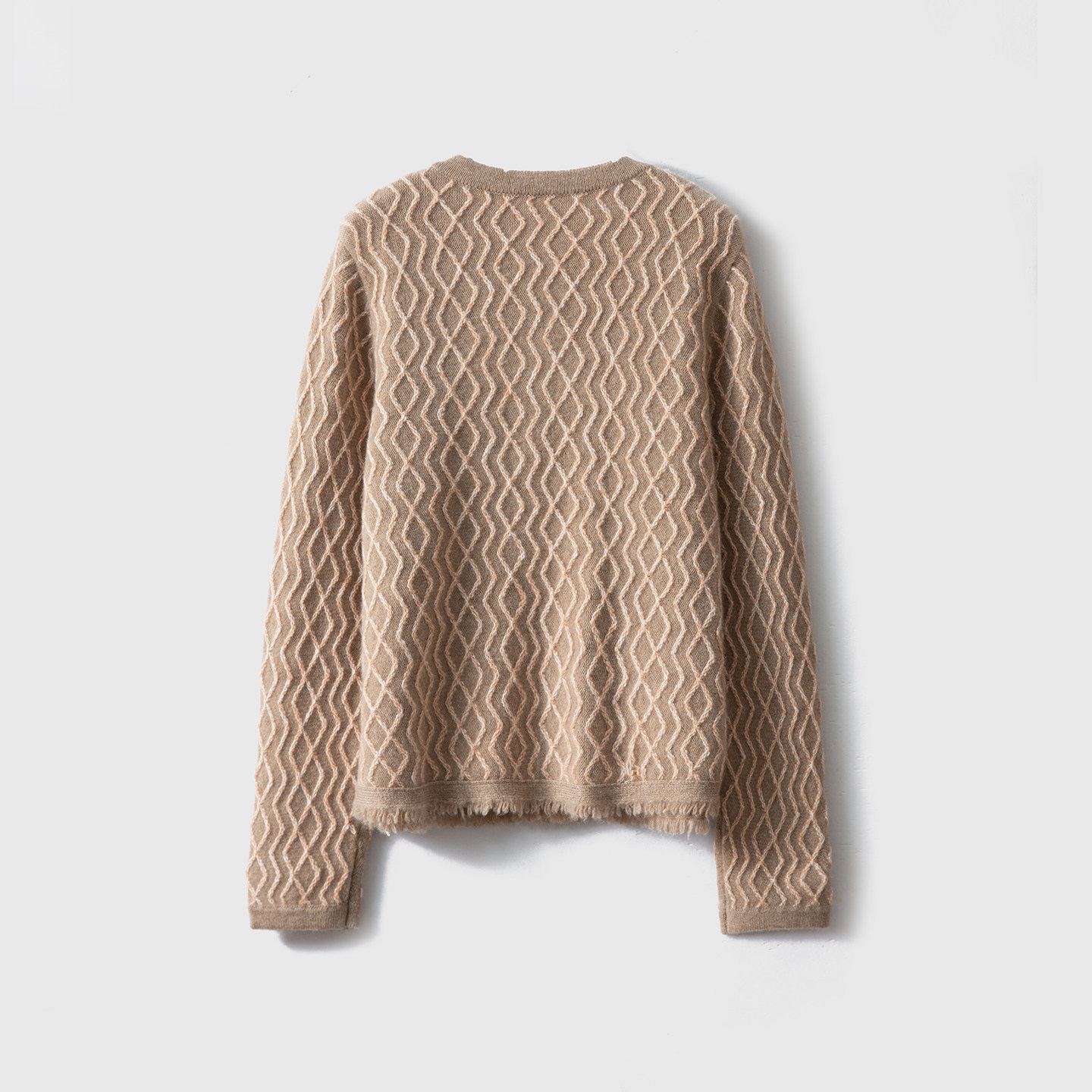 为您提供商品亏清100%山羊绒重工绞花圆领针织开衫 外套驼色冬 毛衣女加厚羊绒衫的详细介绍,