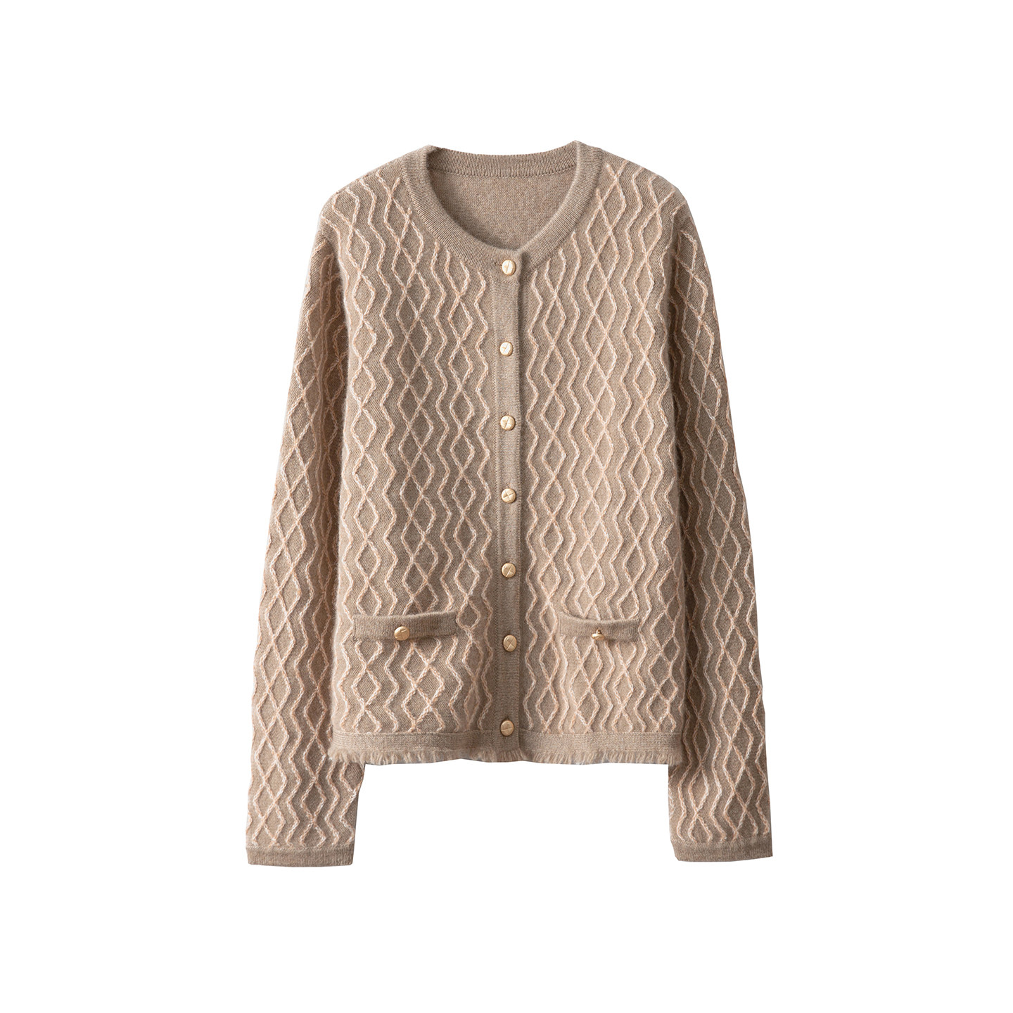 亏清100%山羊绒重工绞花圆领针织开衫 外套驼色冬 毛衣女加厚羊绒衫由
