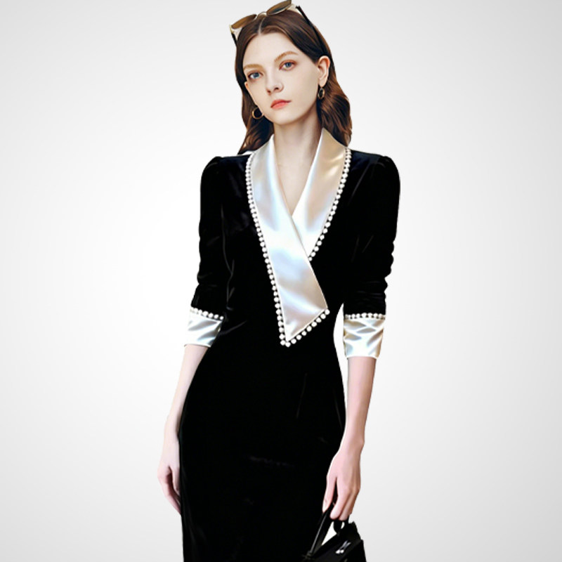 领收腰显瘦气质连衣裙女2026春款 中长裙黑色宴会礼服 西装 兰卡时尚