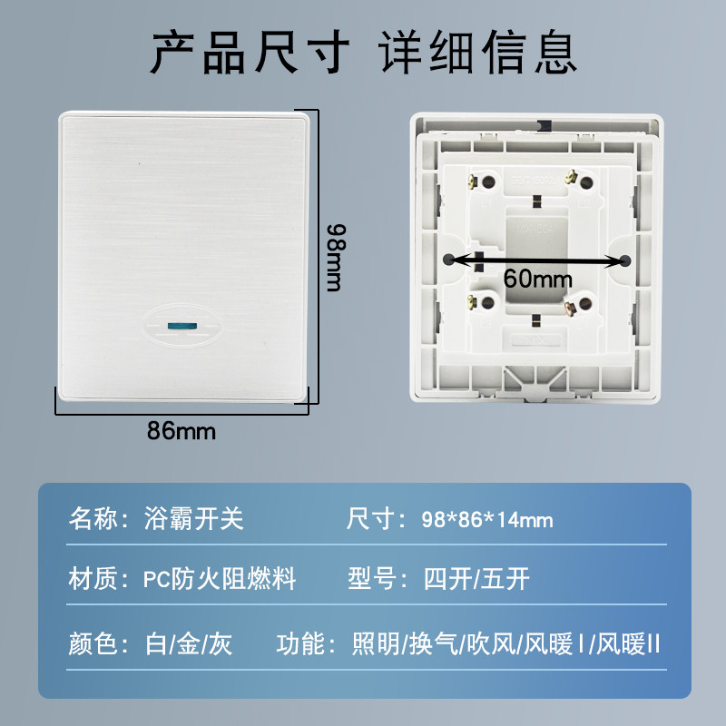 为您提供商品家用86型浴霸专用开关通用16A大功率四开五开五合一浴室防水滑盖的详细介绍,