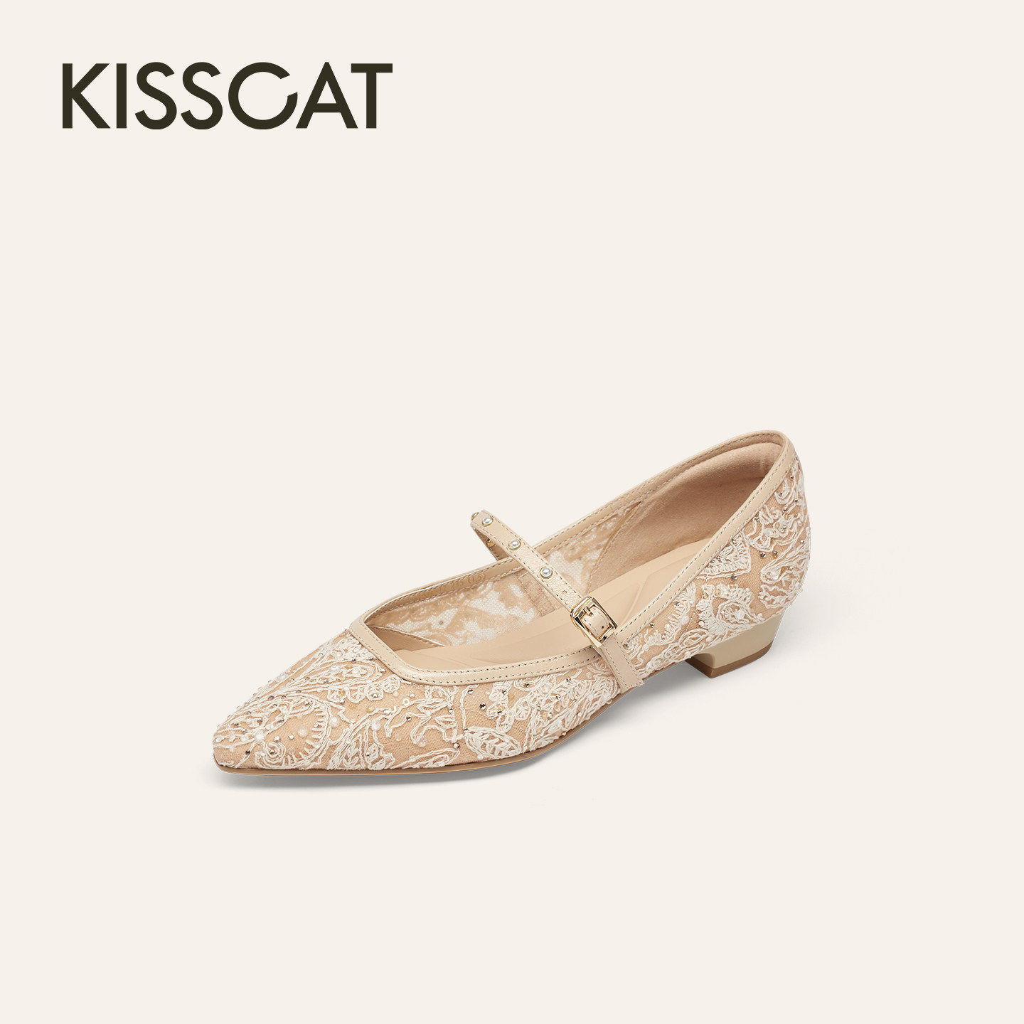 KISSCAT接吻猫2026春季 单鞋 女K76124A 气质蕾丝玛丽珍平底婚鞋