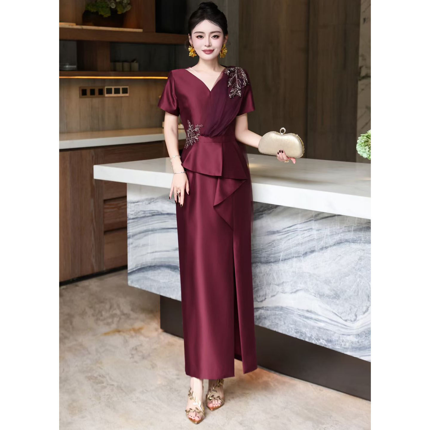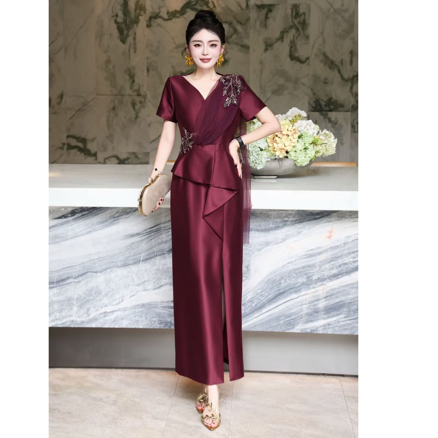 订钻礼服长裙优雅显瘦气质宴会连衣裙酒红色 婚礼喜妈妈喜婆婆修身