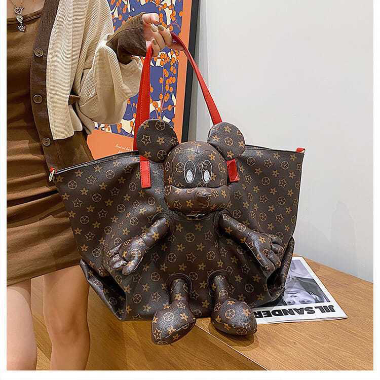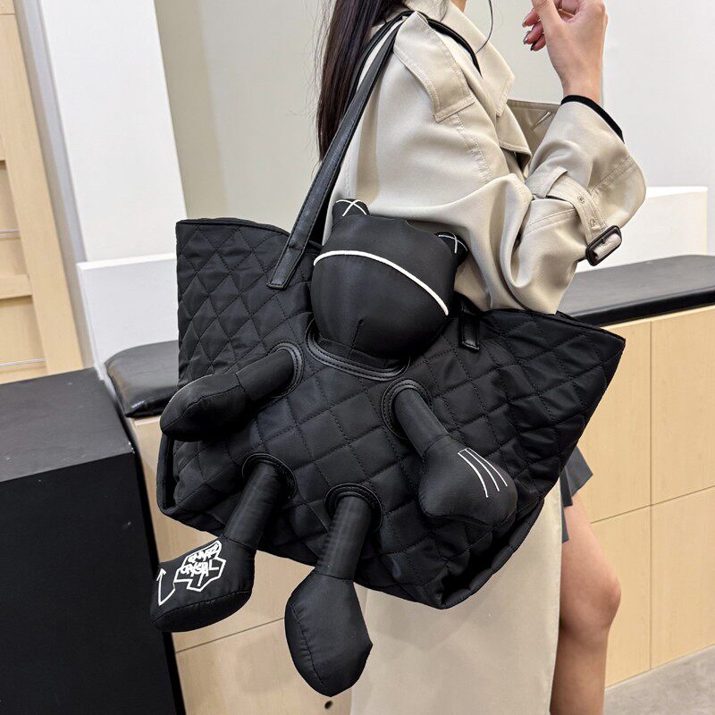 卡通公仔托特包女大容量黑色菱格纹单肩手提包休闲百搭