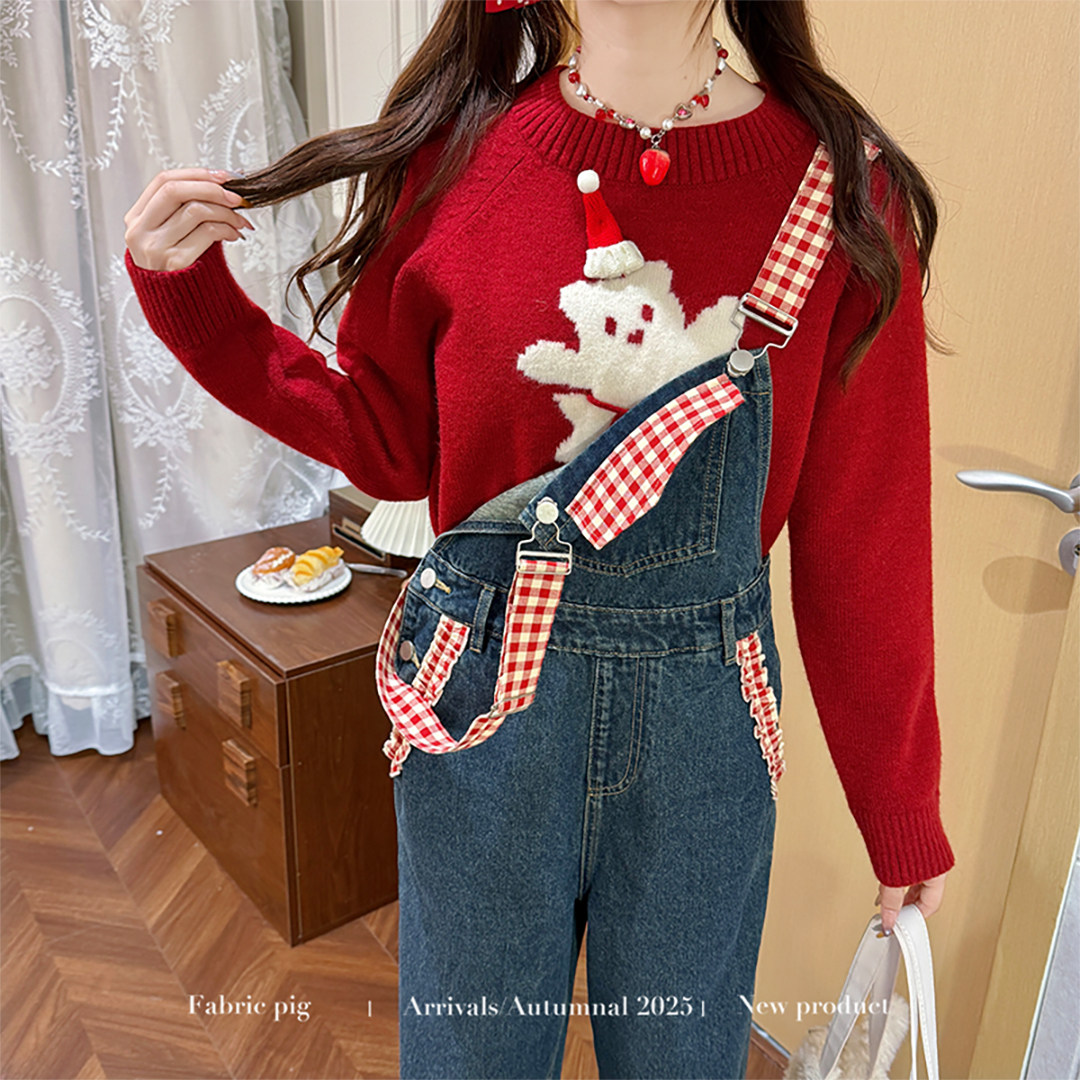 织物猪 慵懒感红色圆领毛衣女秋冬可爱松弛套头针织上衣 芭蕾小熊由