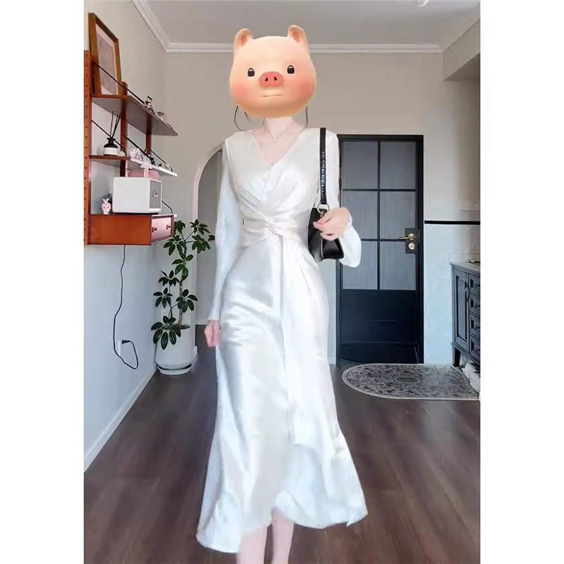 春季 富家千金风miu系度假风白色缎面连衣裙女 冷淡系独特别致法式由