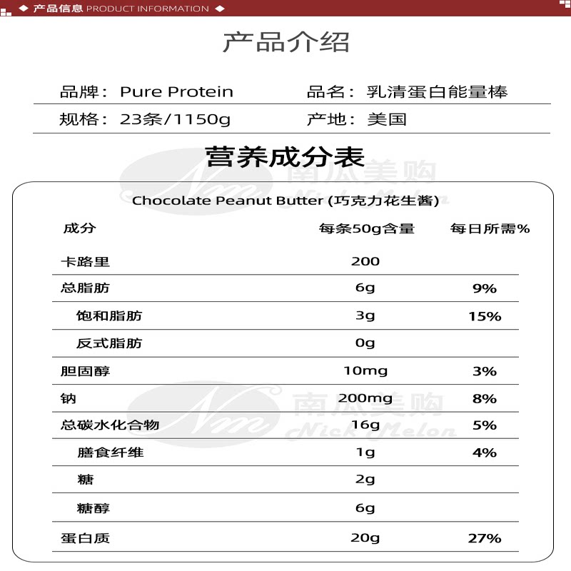 为您提供商品Protein乳清蛋白能量棒23条健身户外咀嚼糖压缩干粮 美国直邮Pure的详细介绍,