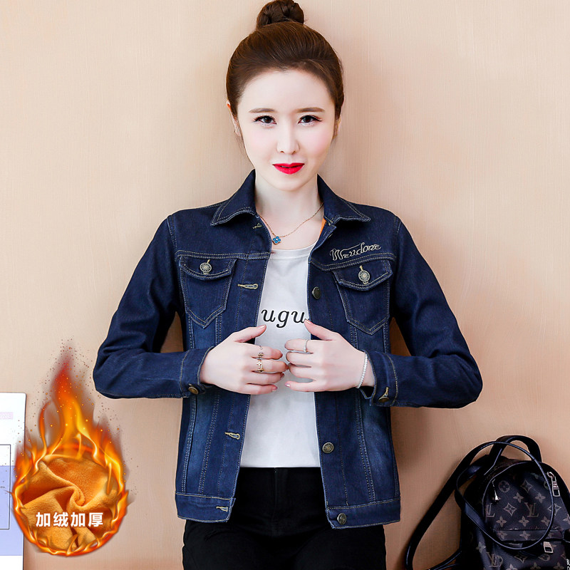 弹力刺绣外套胖MM显瘦百搭上衣棉服潮 秋冬加绒加厚牛仔棉衣女大码