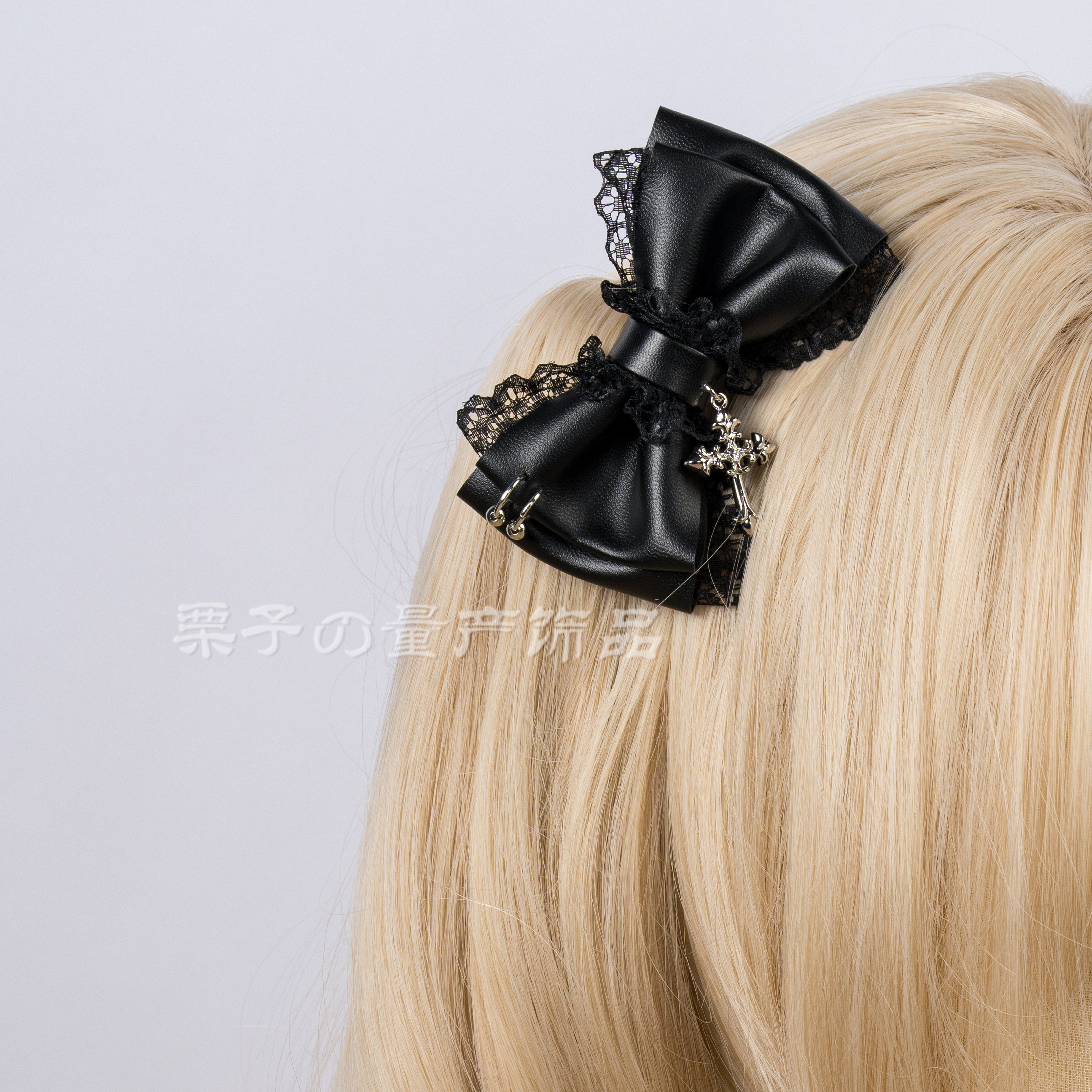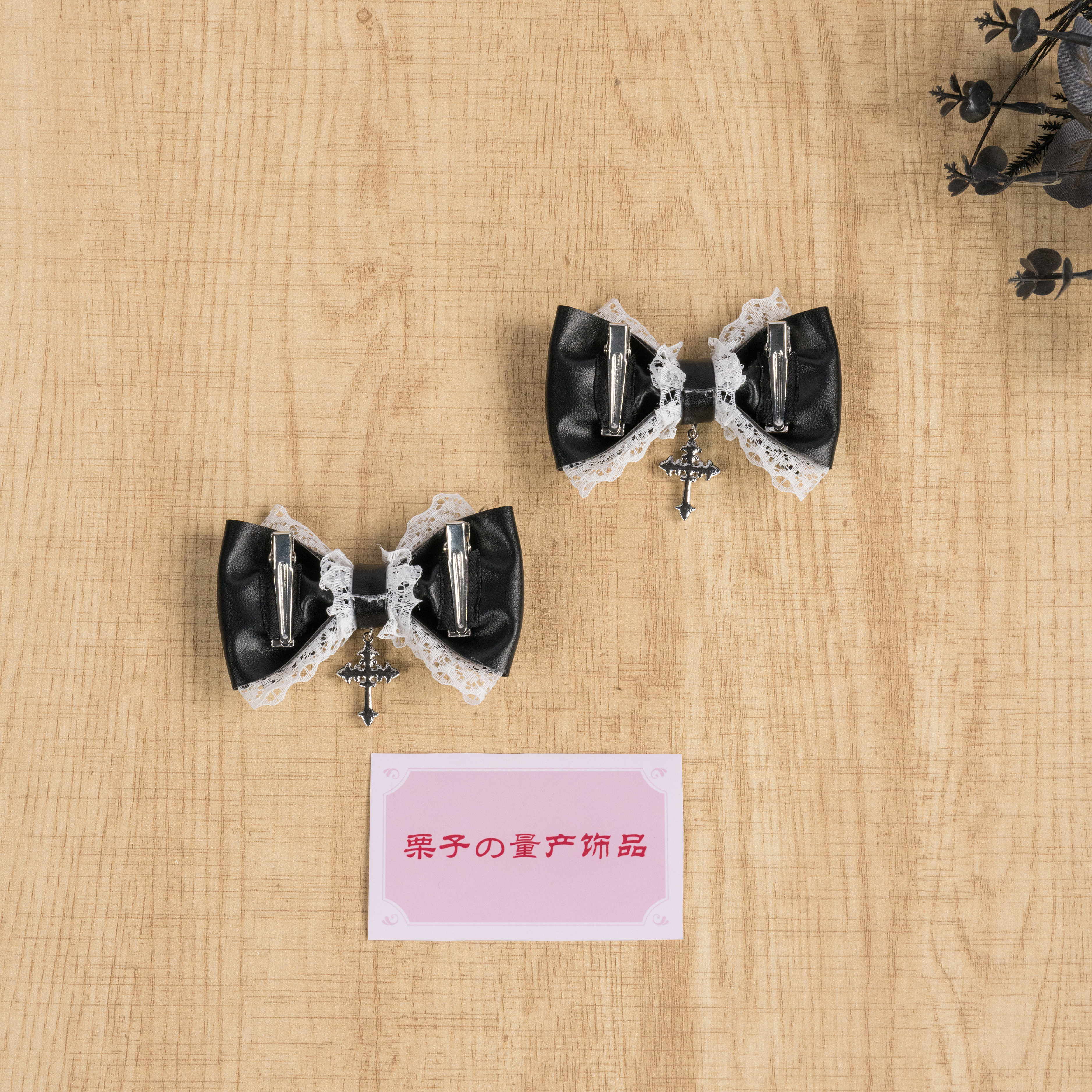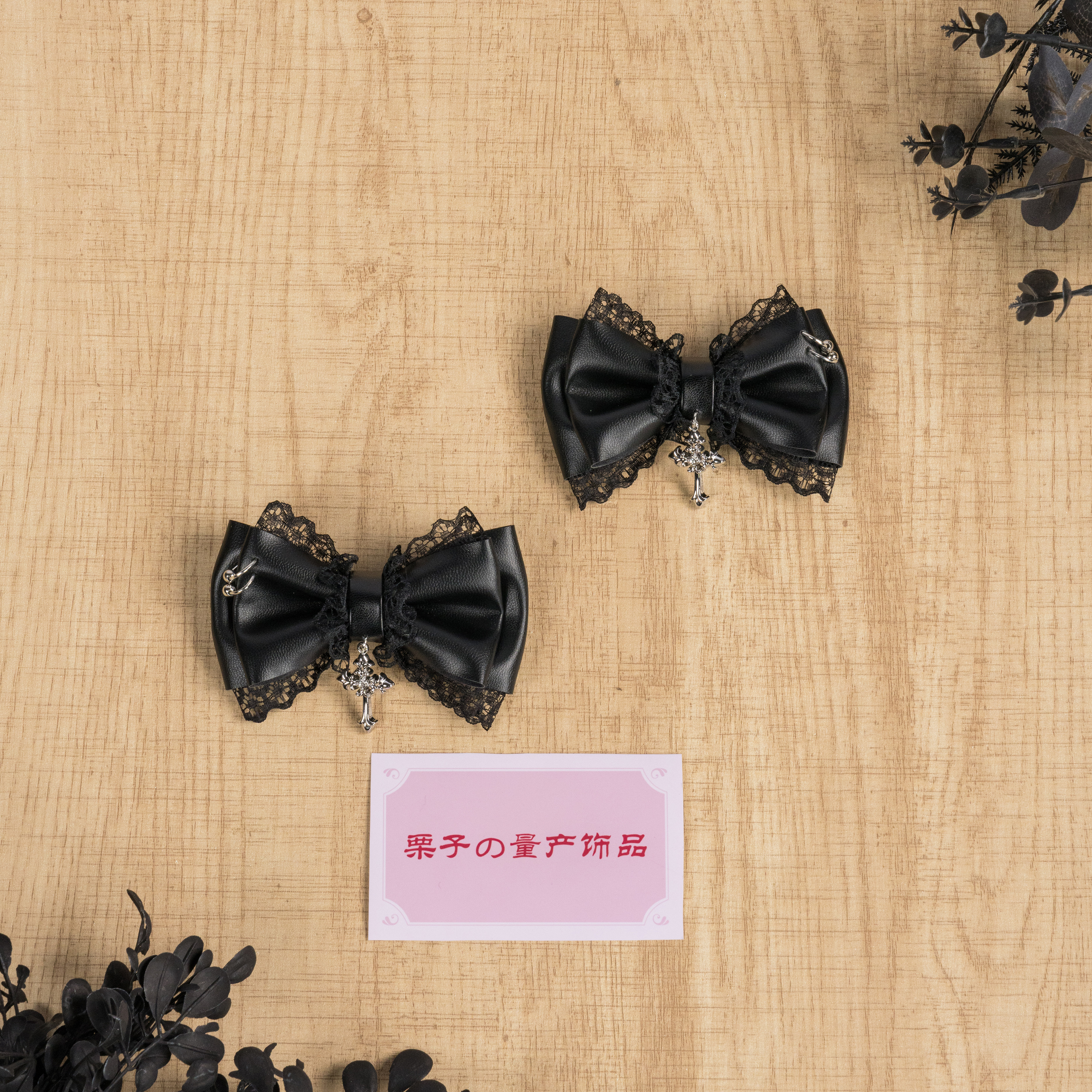 原创手作蕾丝皮质蝴蝶结十字架发夹暗黑哥特蕾蕾系双马尾甜酷对夹
