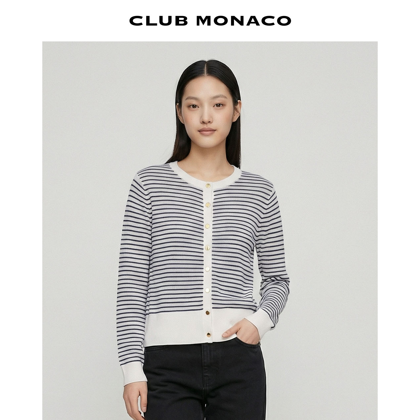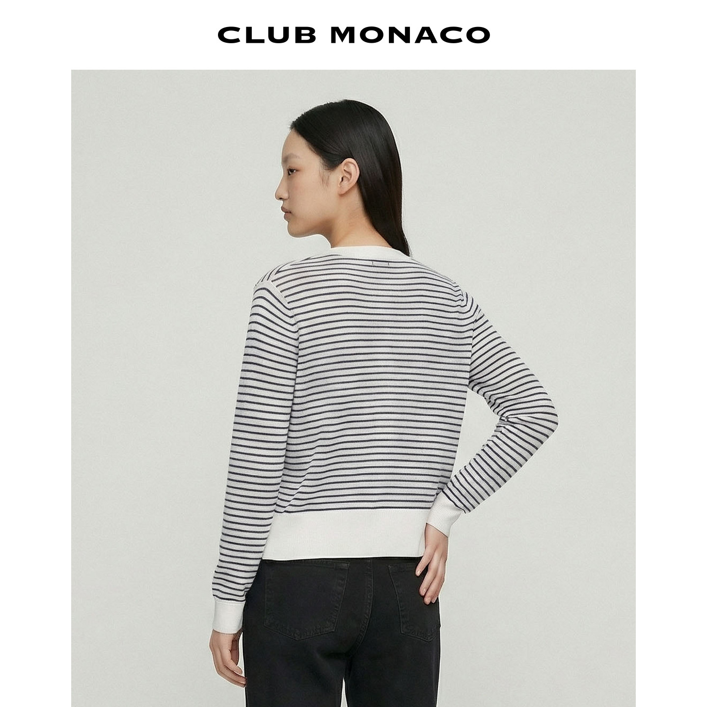 针织亚麻天丝开衫 MONACO女士早春休闲条纹舒适圆领长袖 CLUB由
