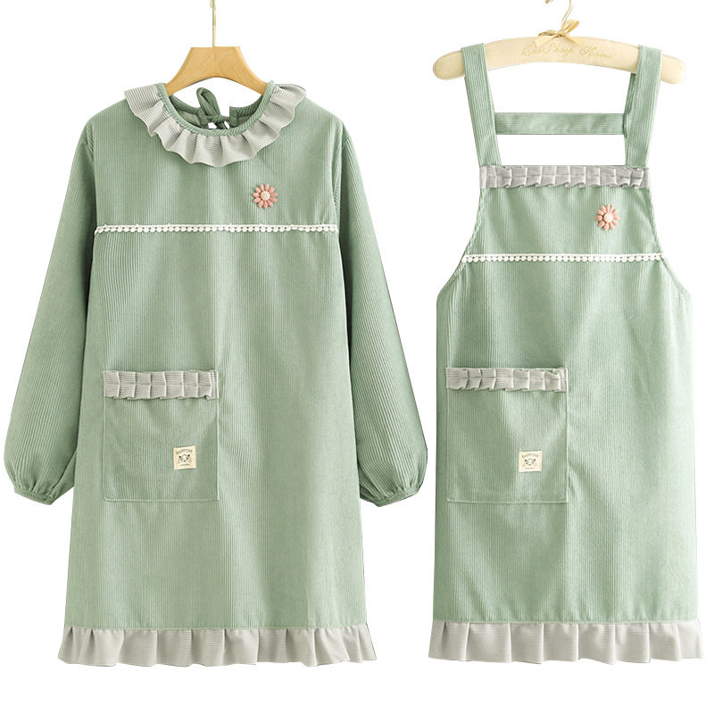 围裙防污耐脏罩衣女入照衣 淡绿绿可爱花边领网红厨房家用条绒长袖