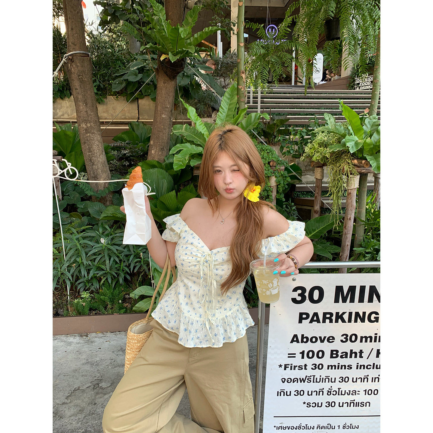 韩系微胖mm春夏法式 你 鱼 凤梨凝酪 碎花上衣 小清新露肩两穿飞袖由