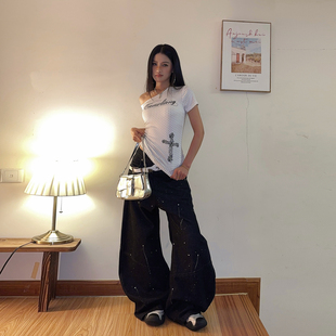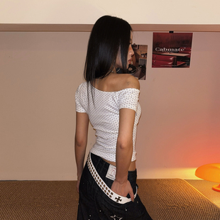 DoubleD白色波点斜肩短袖 辣妹修身 显瘦露肩百搭短款 上衣 T恤女夏季