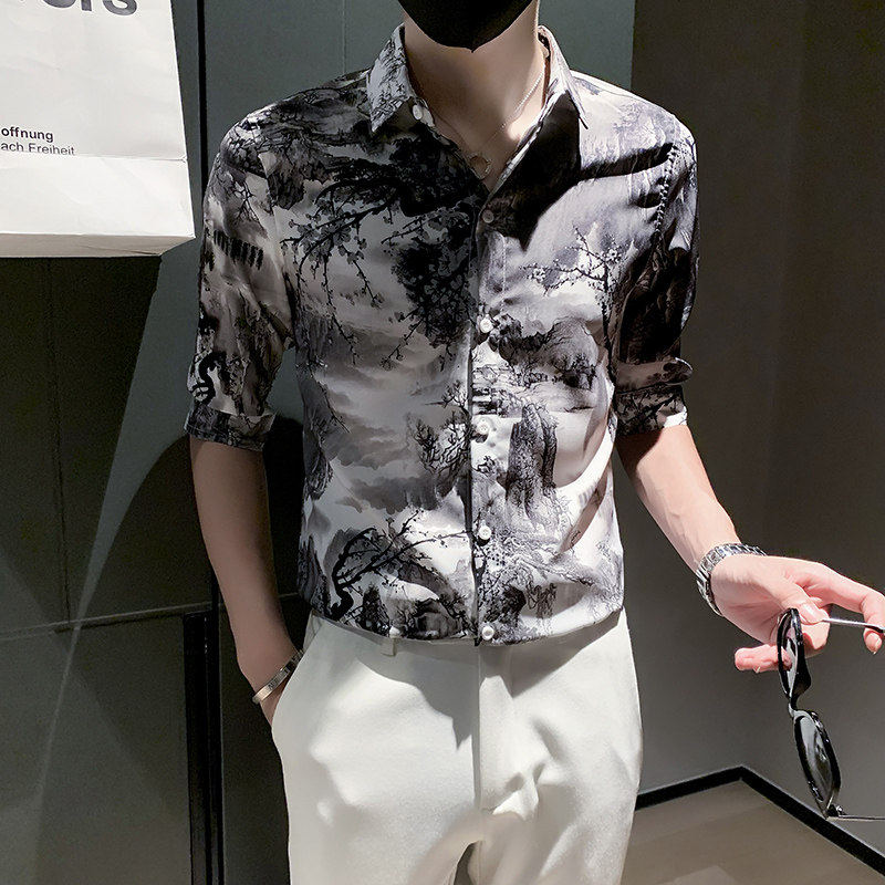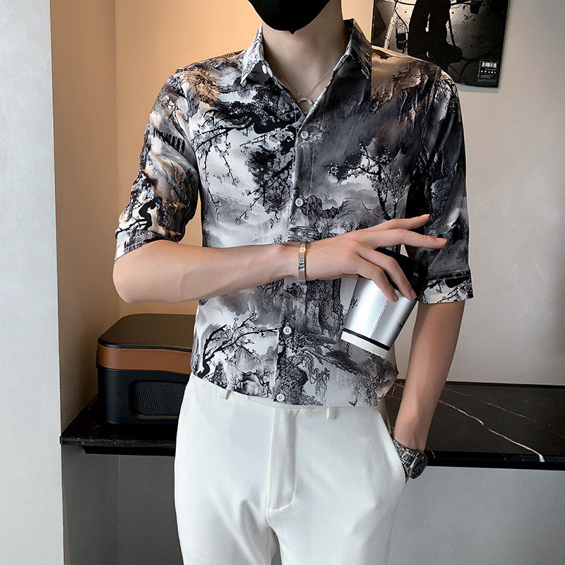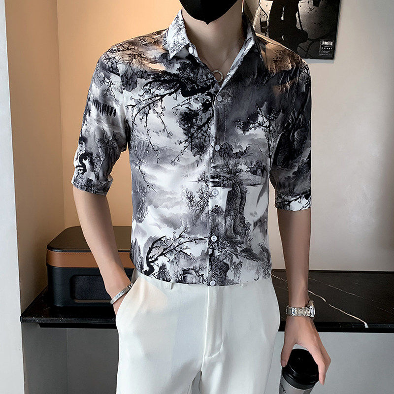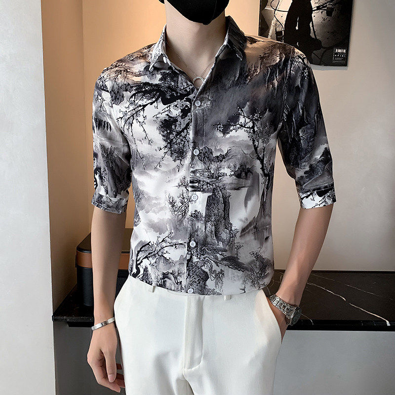 为您提供商品印花中袖 2026春夏小码 衬衣160 S号XS码 潮流男士 修身 山水画五分衬衫的详细介绍,