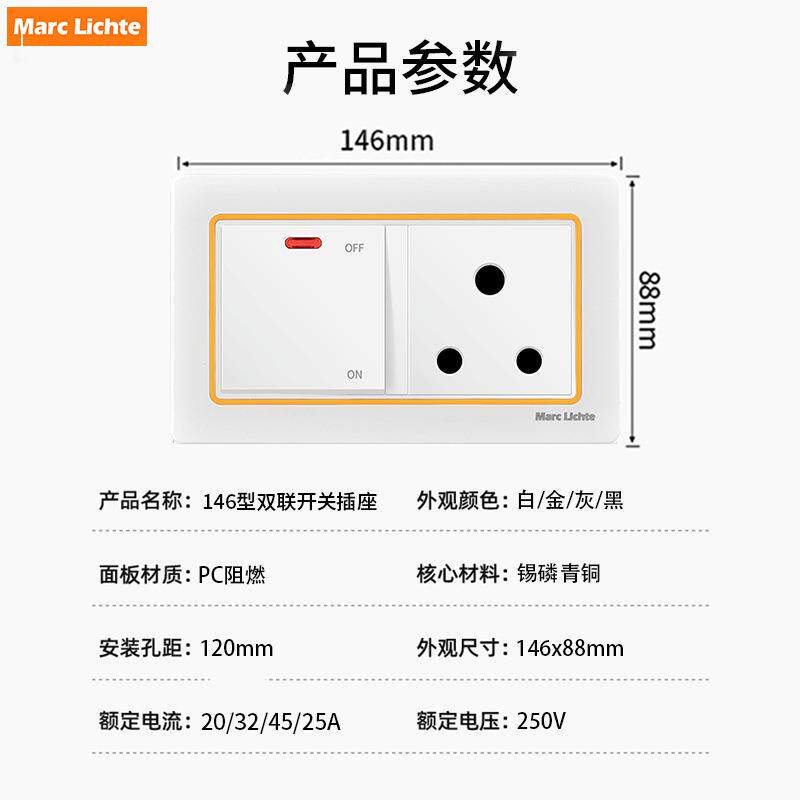 为您提供商品墙壁圆五孔南非开关插座 146型大南非插座面板20A圆三孔带开关暗装的详细介绍,